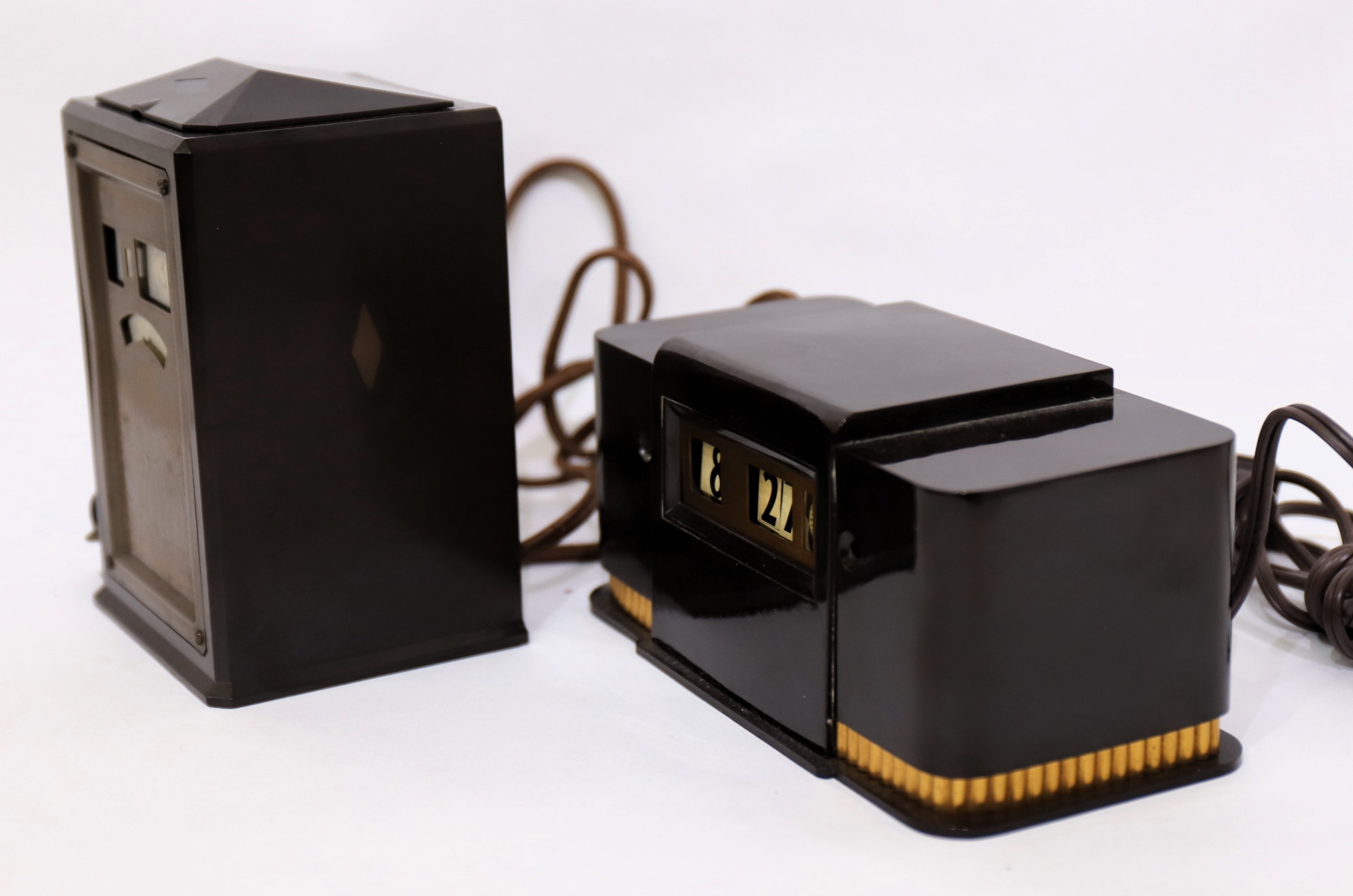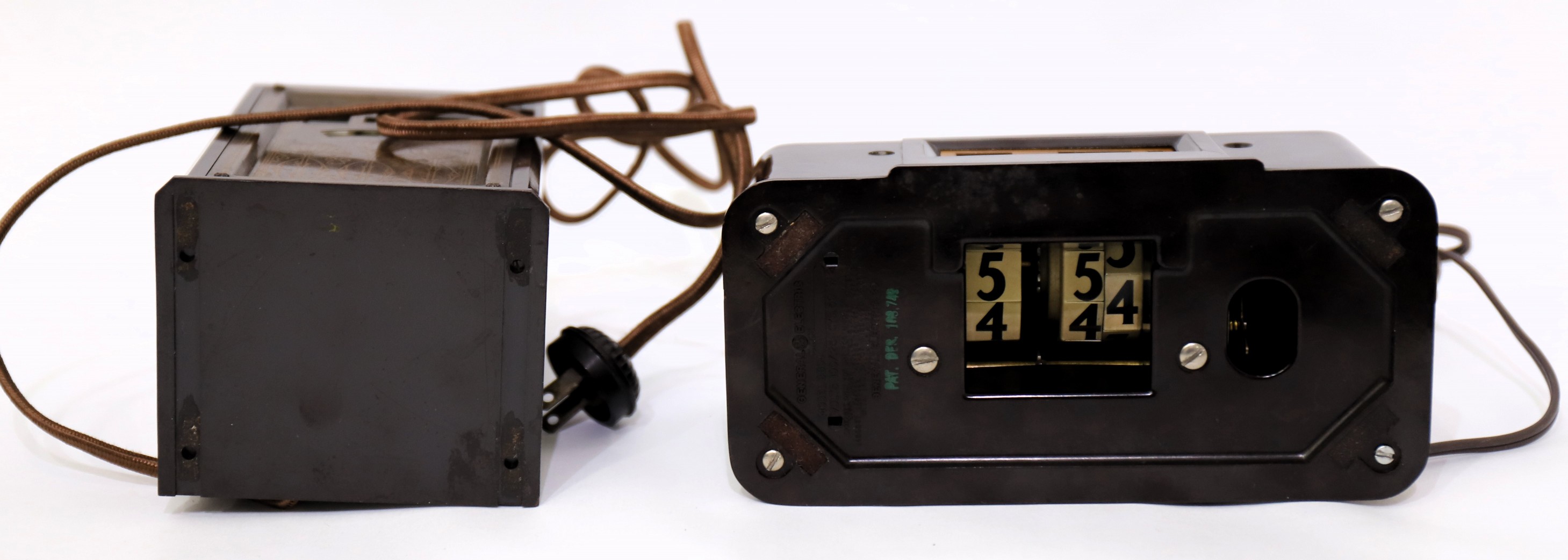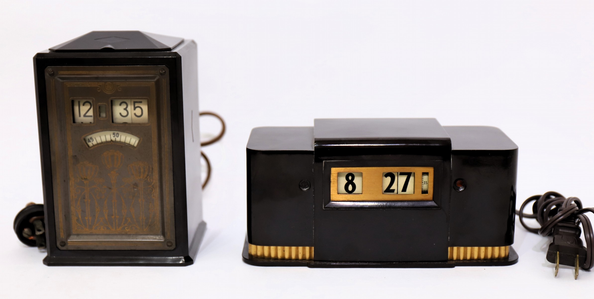 Executive”, ca. 1933 and 1940. Two electric digital (cyclometer) clocks with rotating numbers. The taller one, The Executive