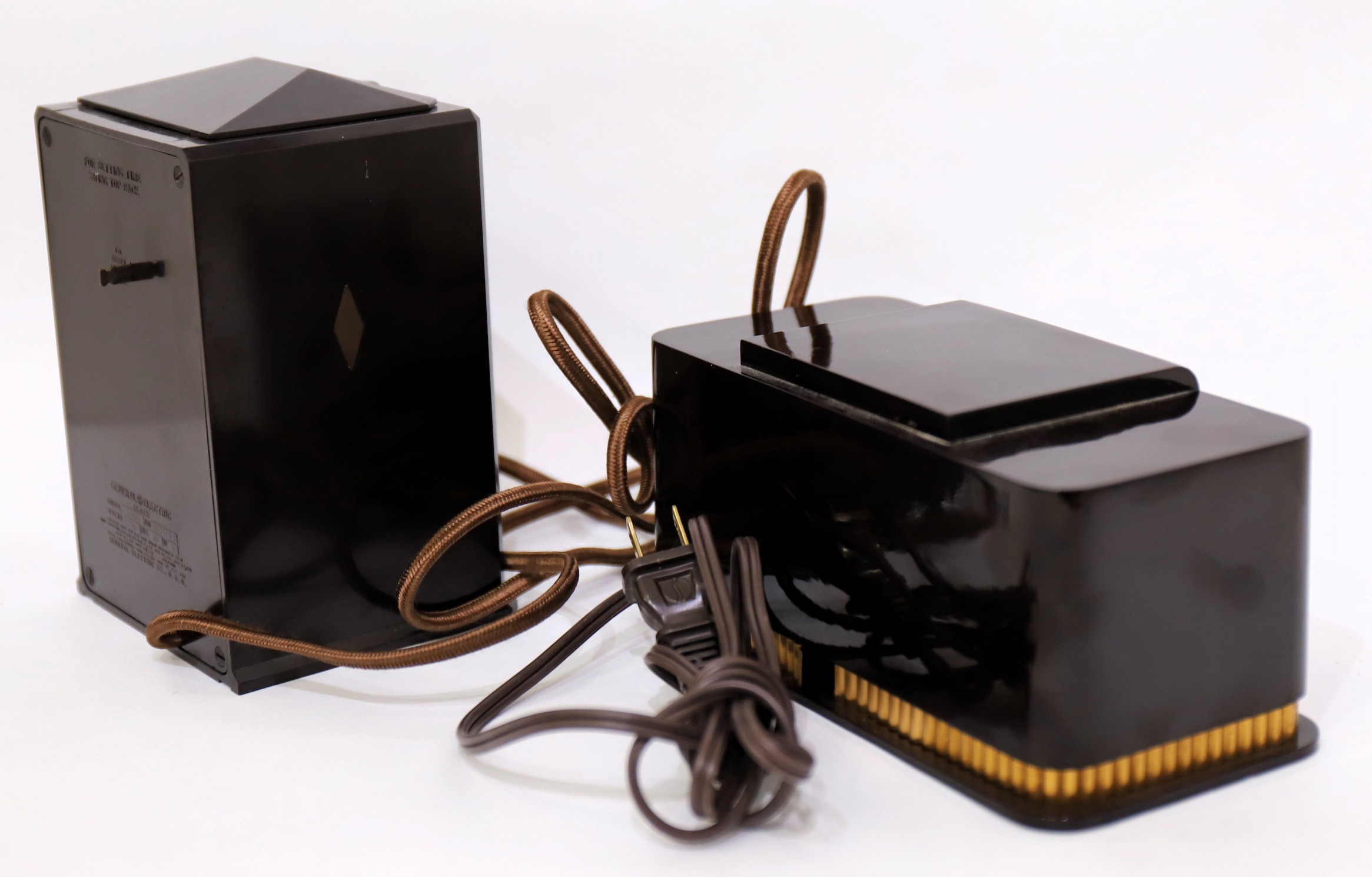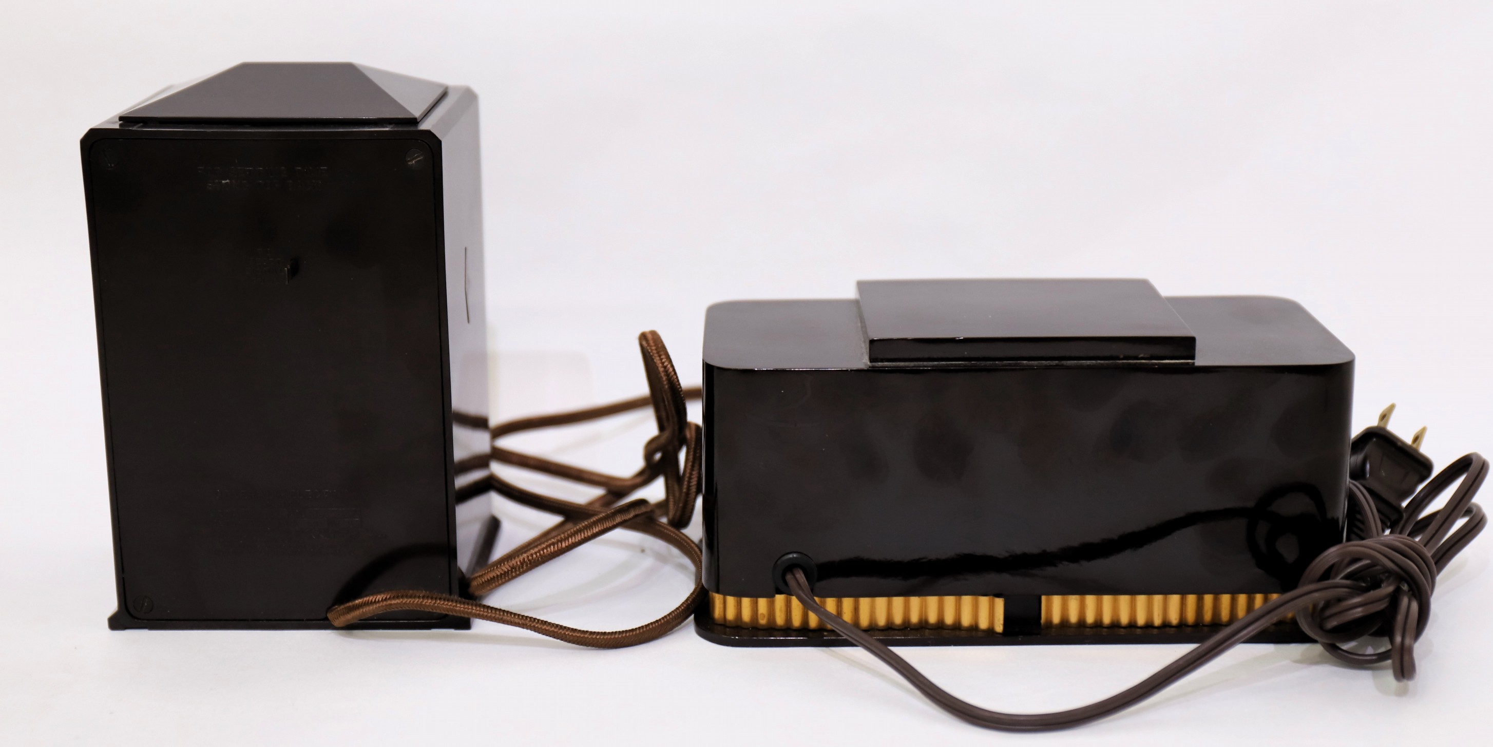 case is dark brown and was designed by Walter Dorwin, a noted designer of the time. There is gold foil trim around the base,