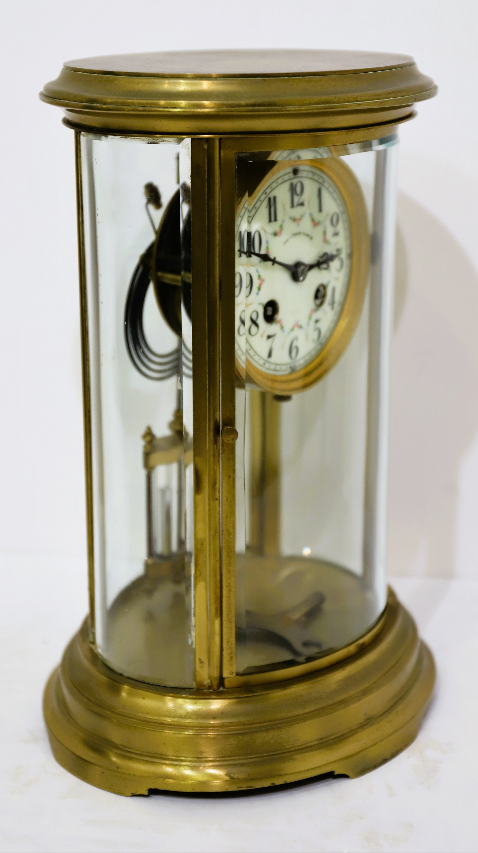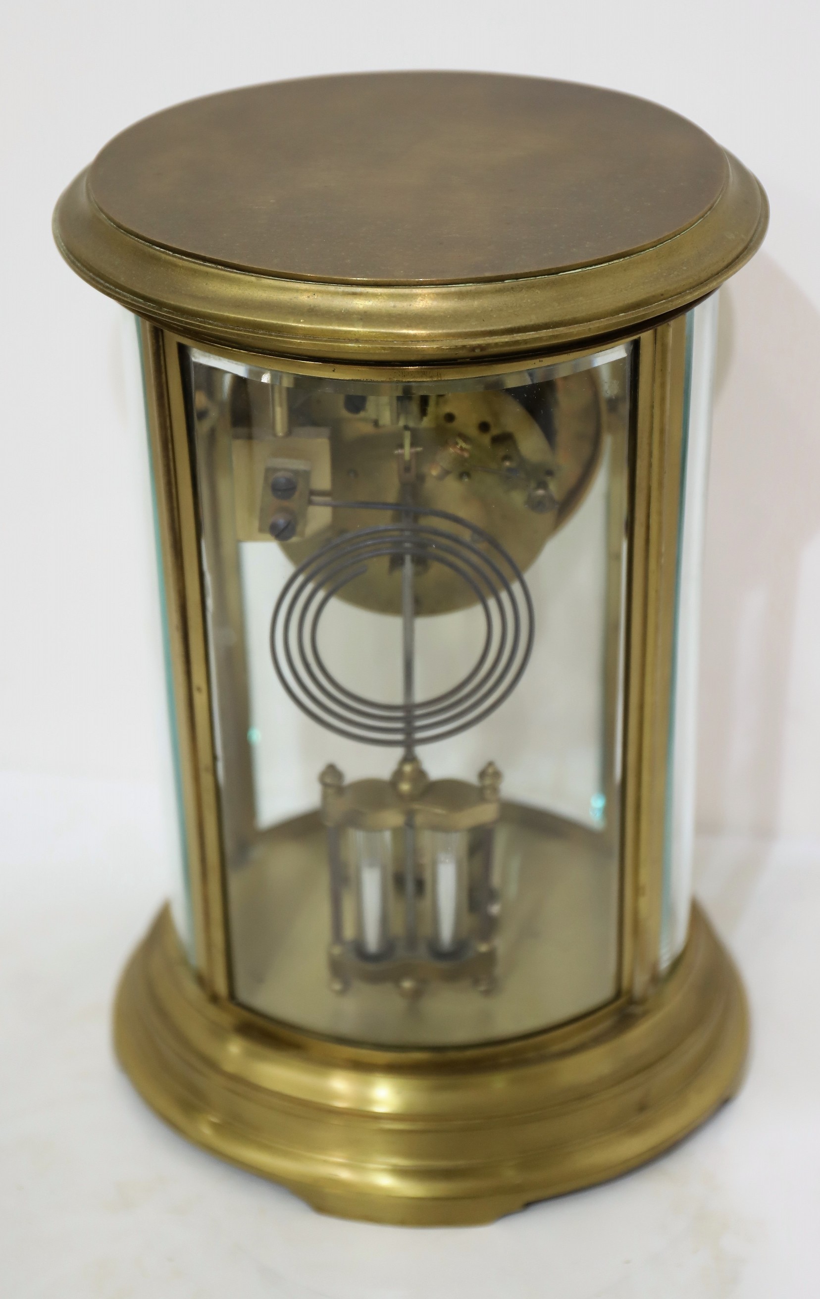 12-inch oval brass case with four beveled, curved glasses. The finish is dull and tarnished in places, the glasses are