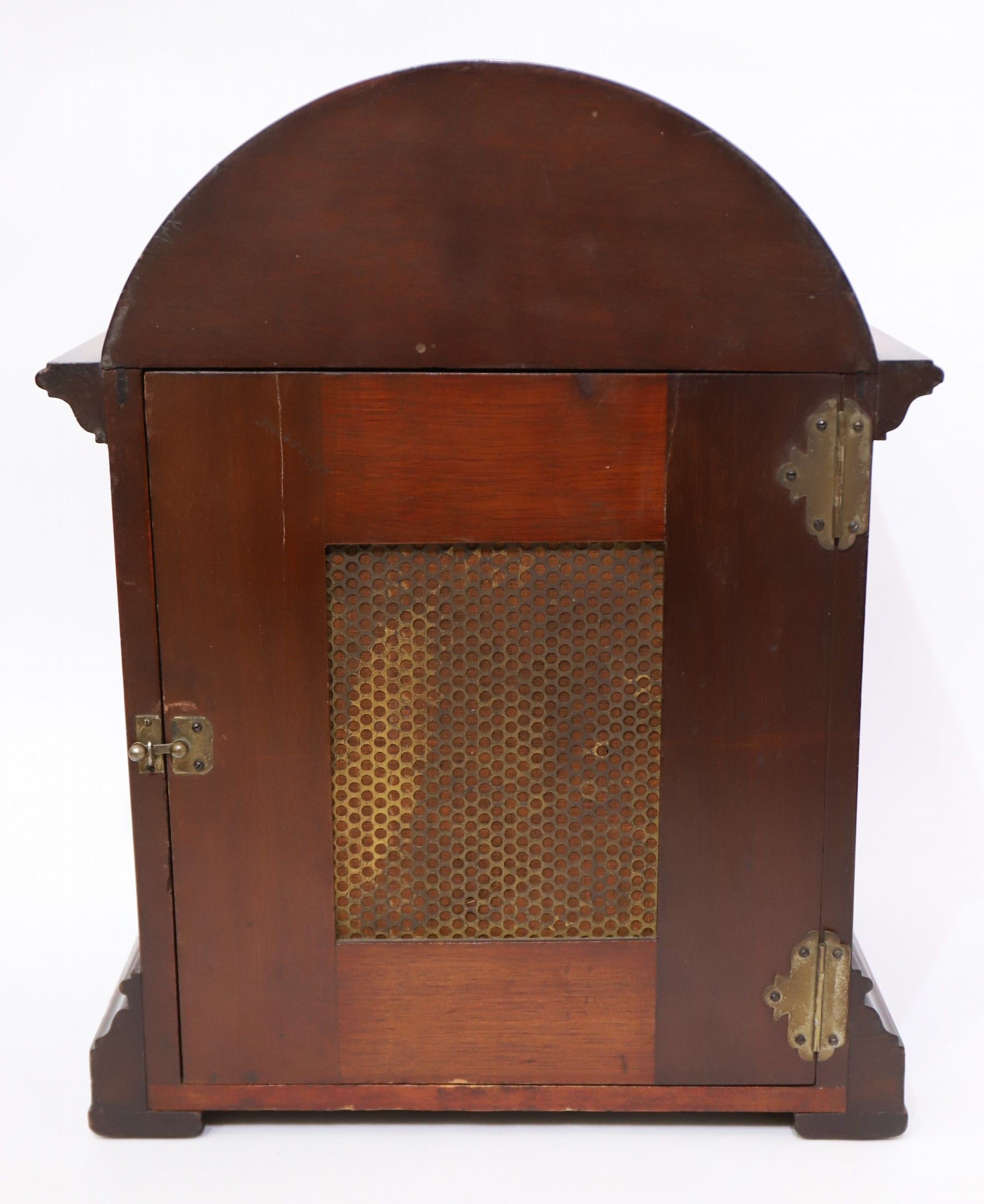 elaborate nine-tube tall case clocks, in competition with Walter Durfee. Here we have a small (14-inch) mahogany bracket clock