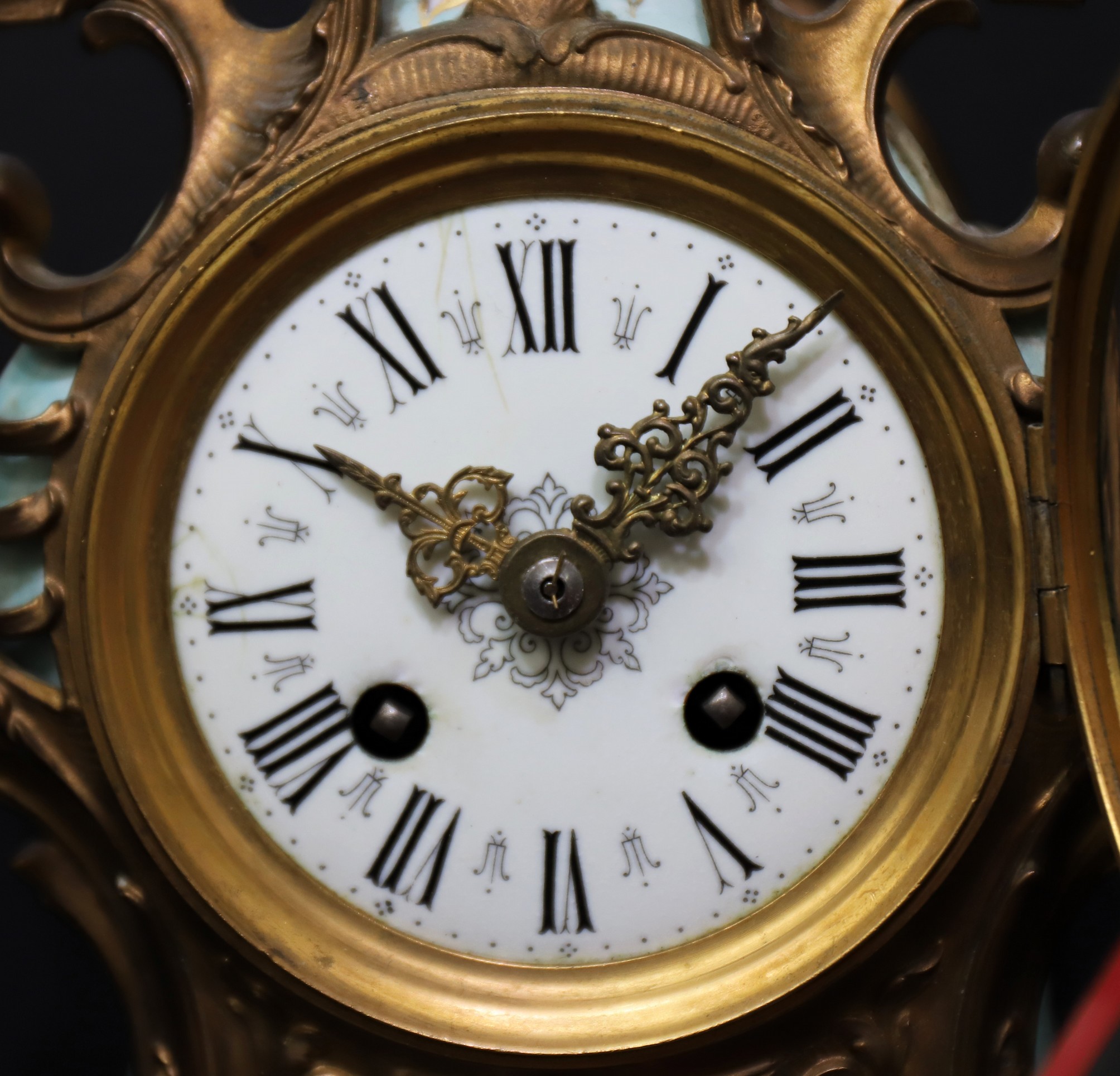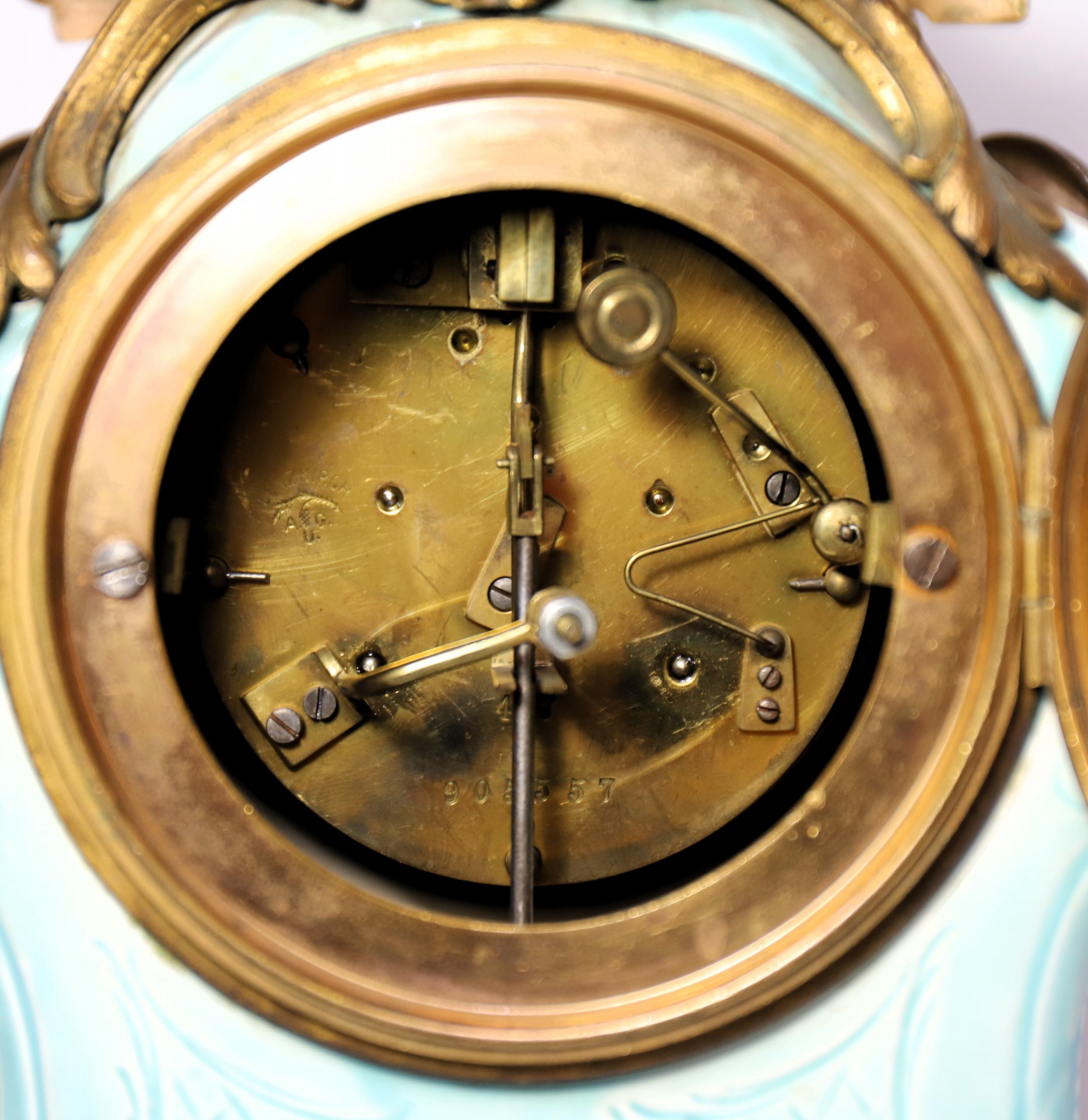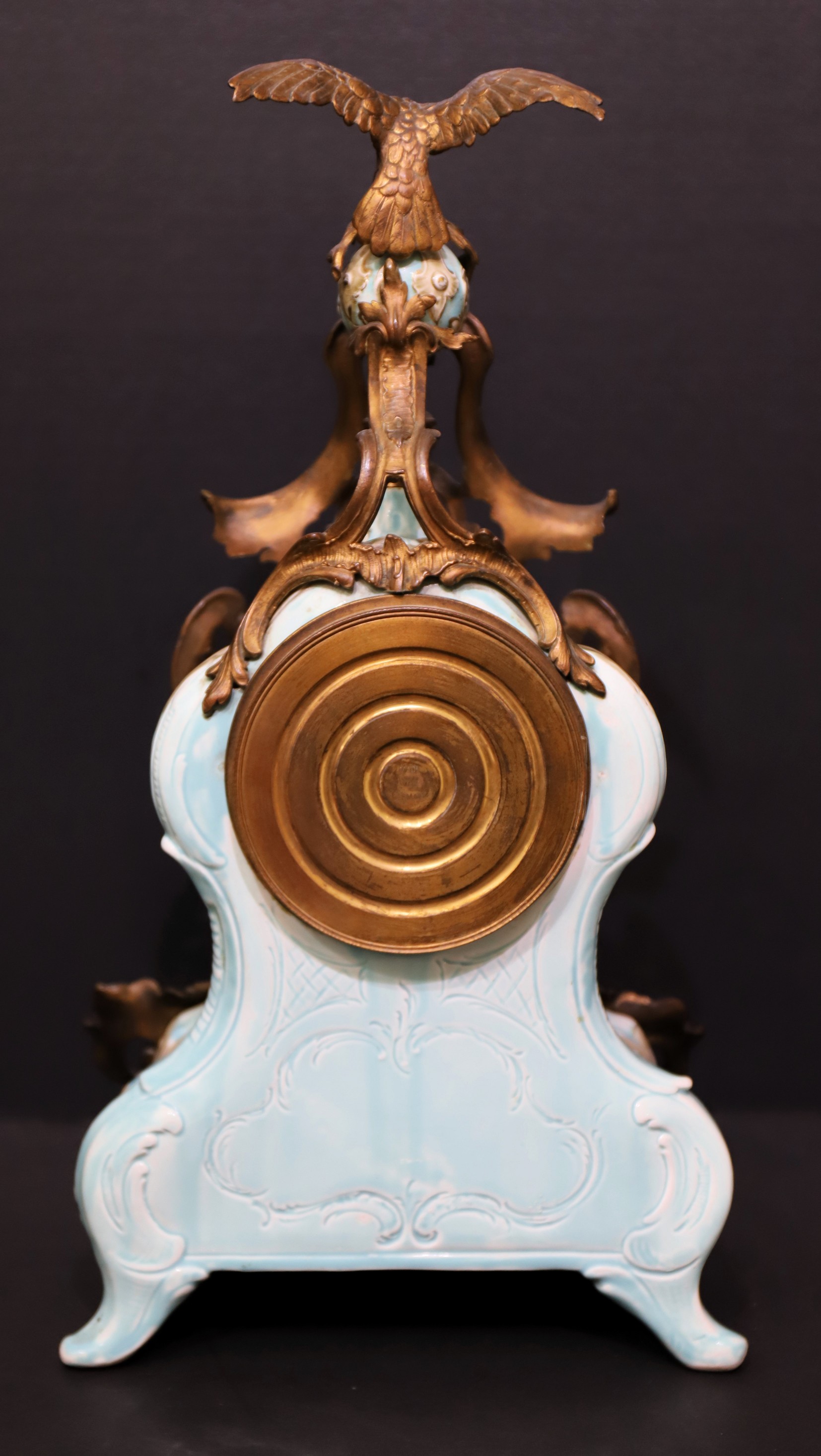porcelain case with brass ornamentation including an eagle on a globe at the top. The dial glass is beveled over a porcelain