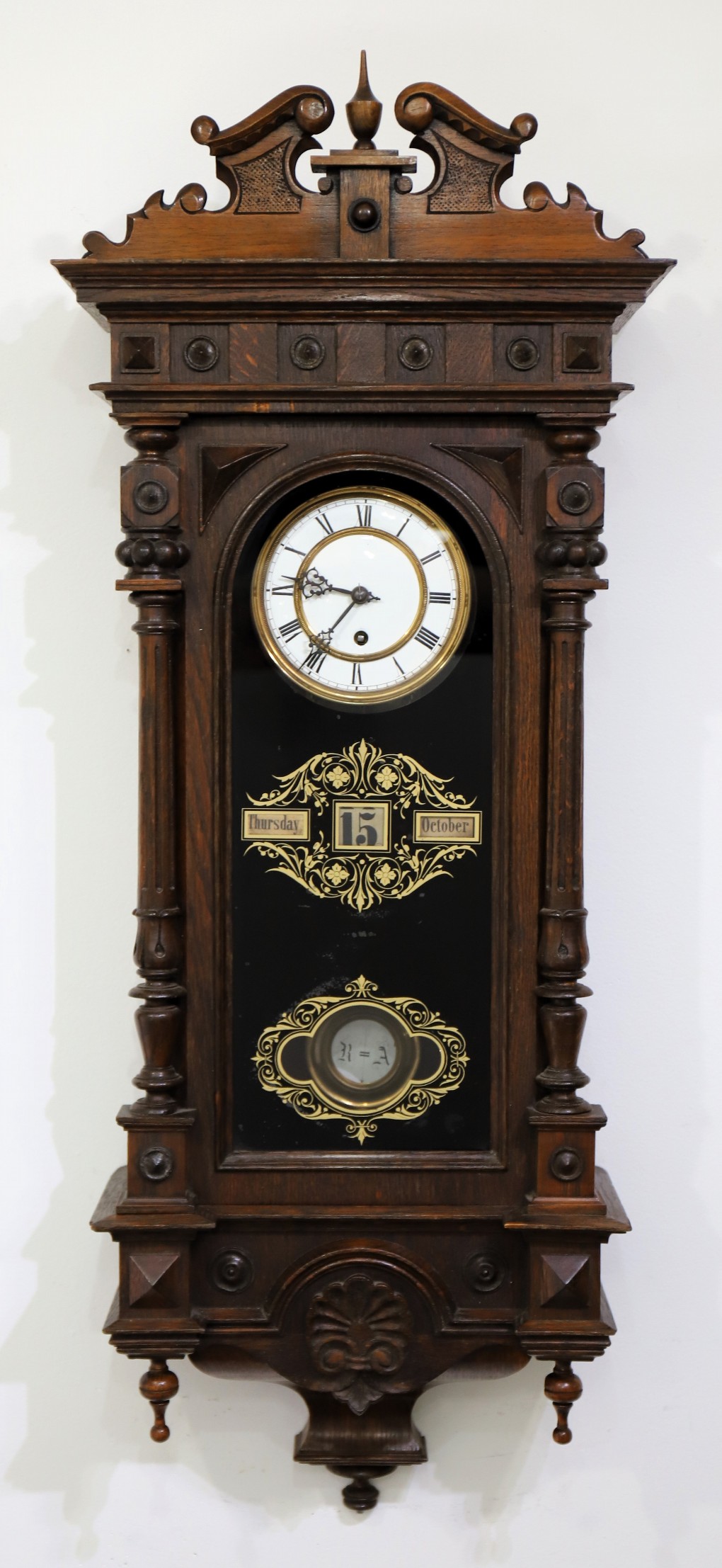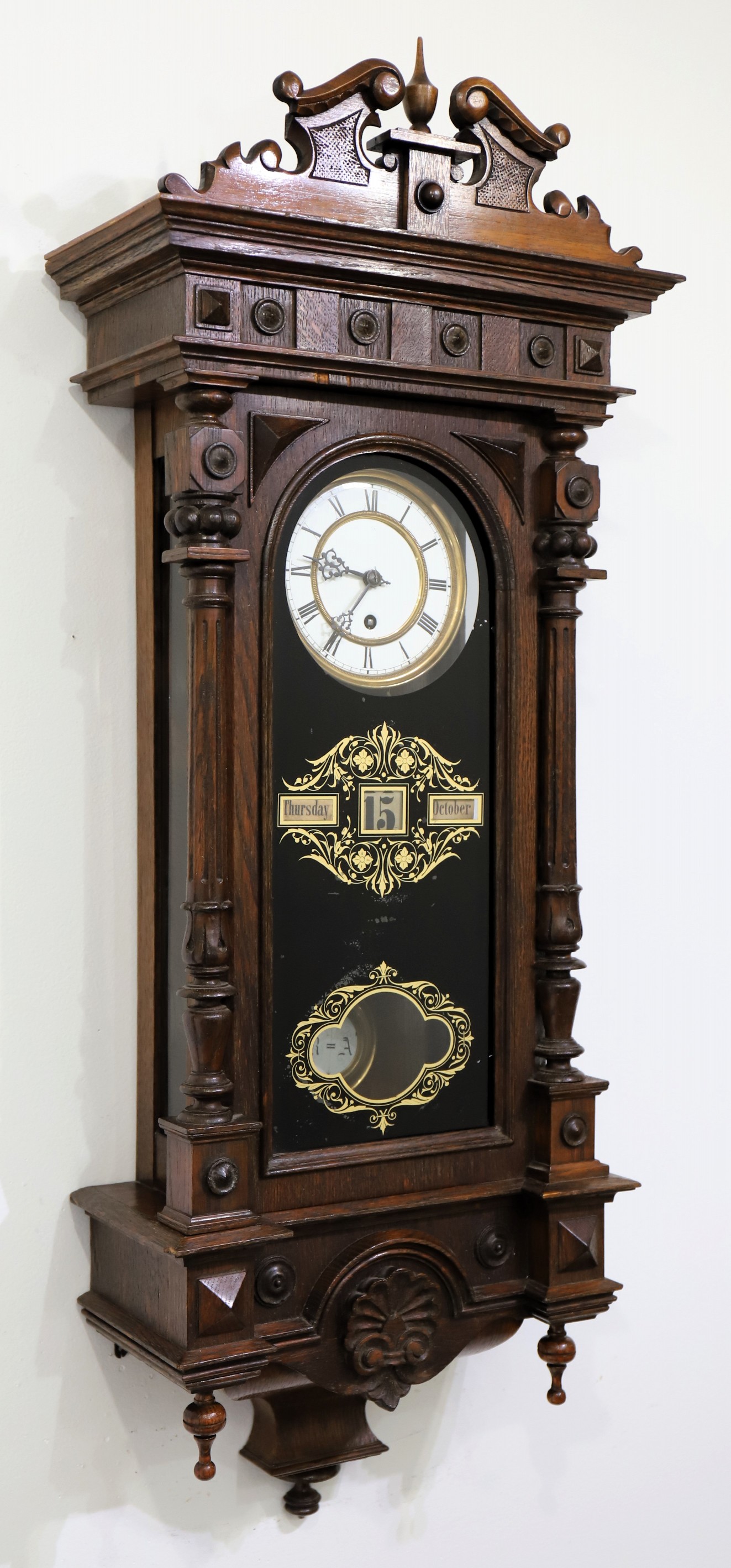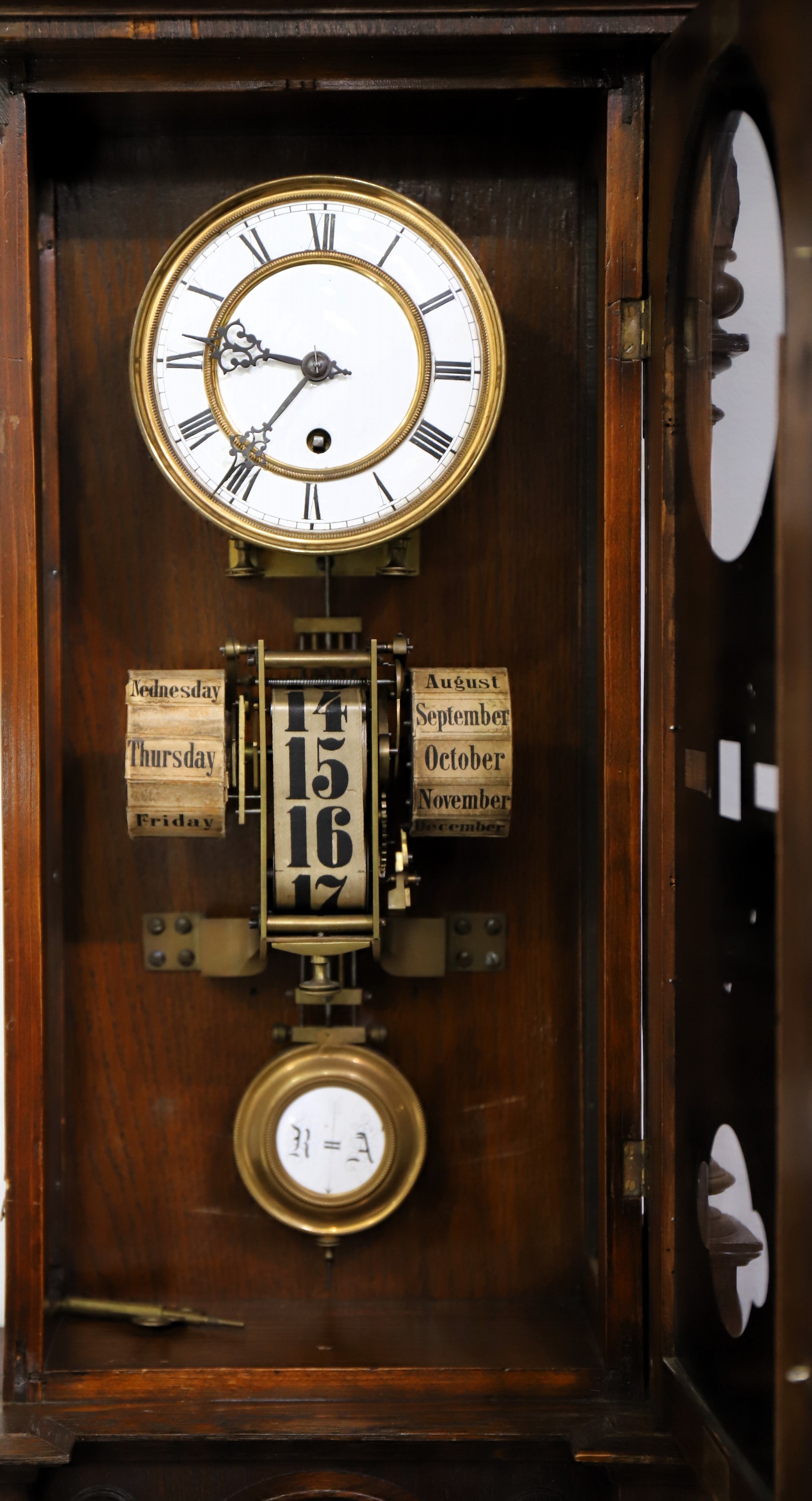 German/Austrian Vienna calendar wall clock, ca. 1900? I can find no indication of the maker of the unusual spring-driven Vienna with a calendar mechanism. The clock is 38 inches