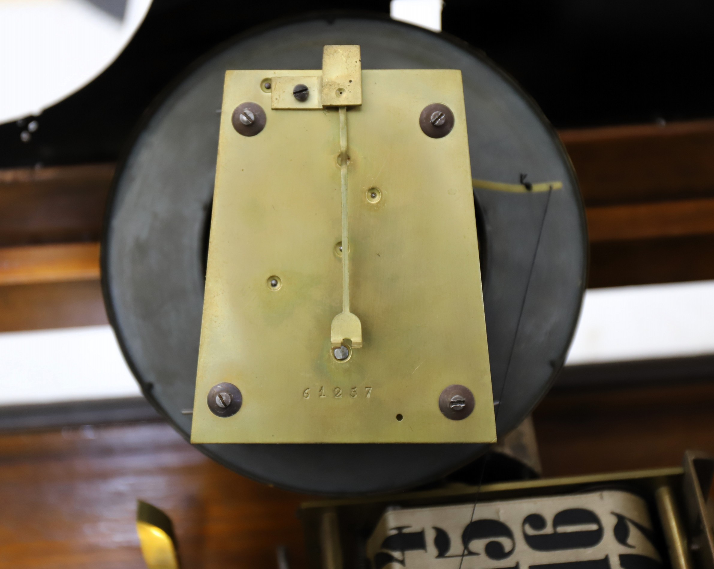 the dial is porcelain, unmarred, with appropriate hands. The 8-day (?) movement is unsigned but bears the serial number 61257. The porcelain R=A center to the pendulum is cracked and chipped. Only one calendar clock listed on LiveAuctioneers, no maker,