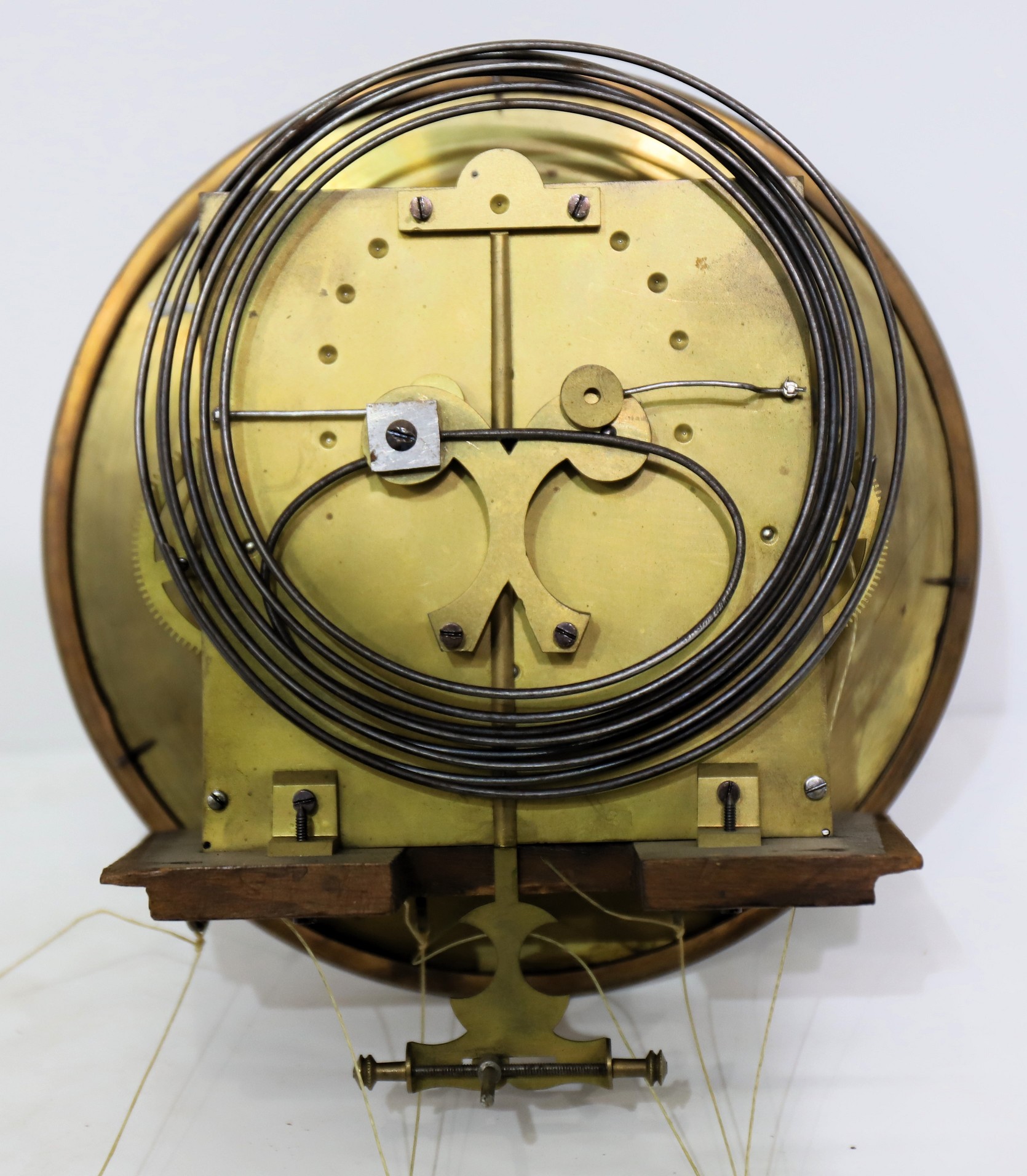 hands are likely original. The 8-day, time-and-strike movement is unsigned, striking on two wire gongs; the clock counts the