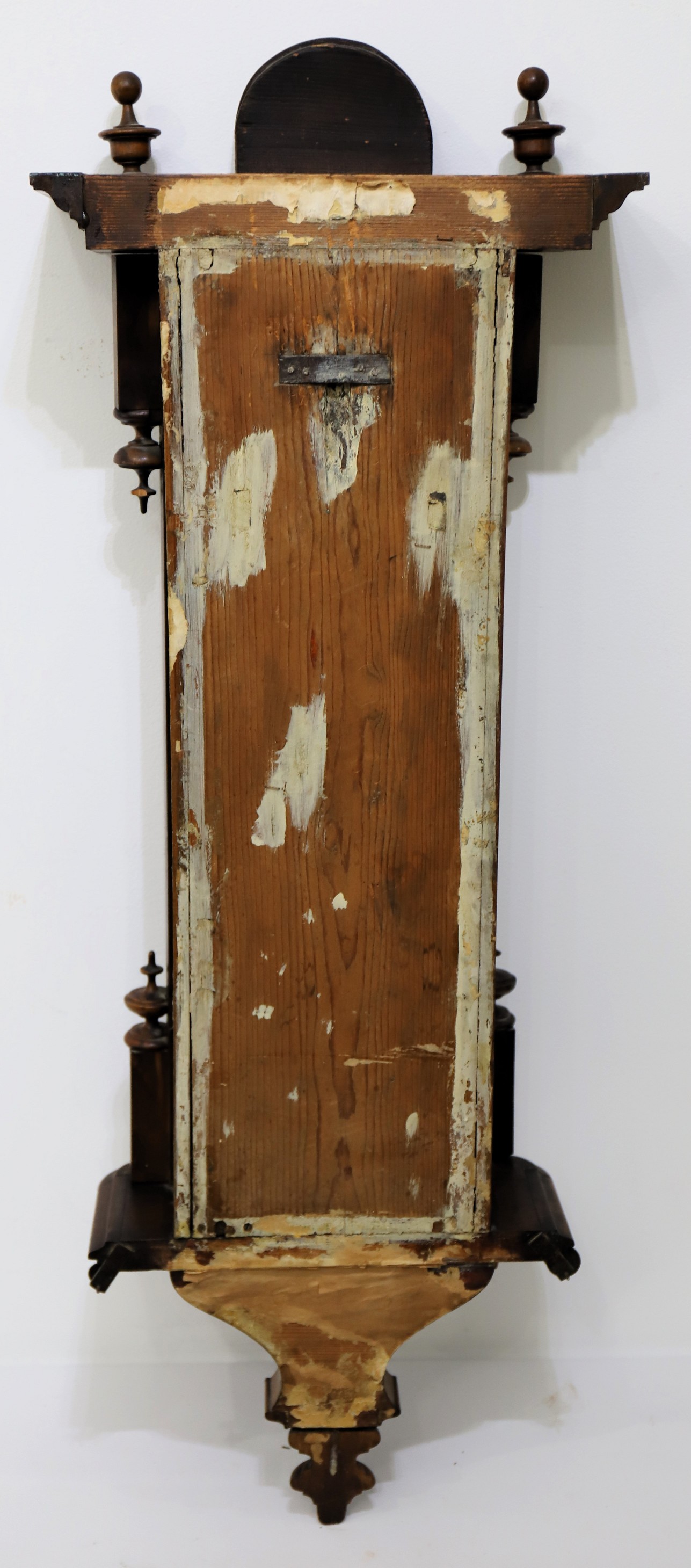 Carl Leiter three-weight Vienna, ca. 1885(?) A 45.5-inch Vienna in walnut with three old glasses, what appear to be the original finials, and a brass ornament on the crest. The porcelain dial is signed by the presumed retailer in Richenau, and island in Lake Constance in southern Germany. The ornate