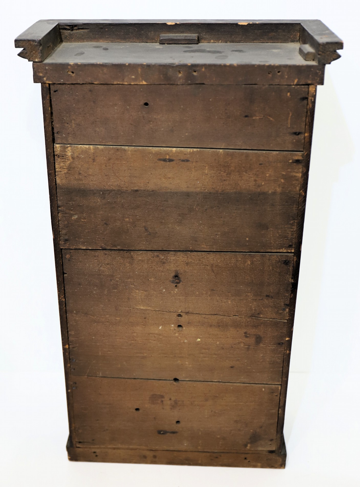 a very old finish, probably original. It is thick with patina and very dark. The columns do not appear to have been painted,