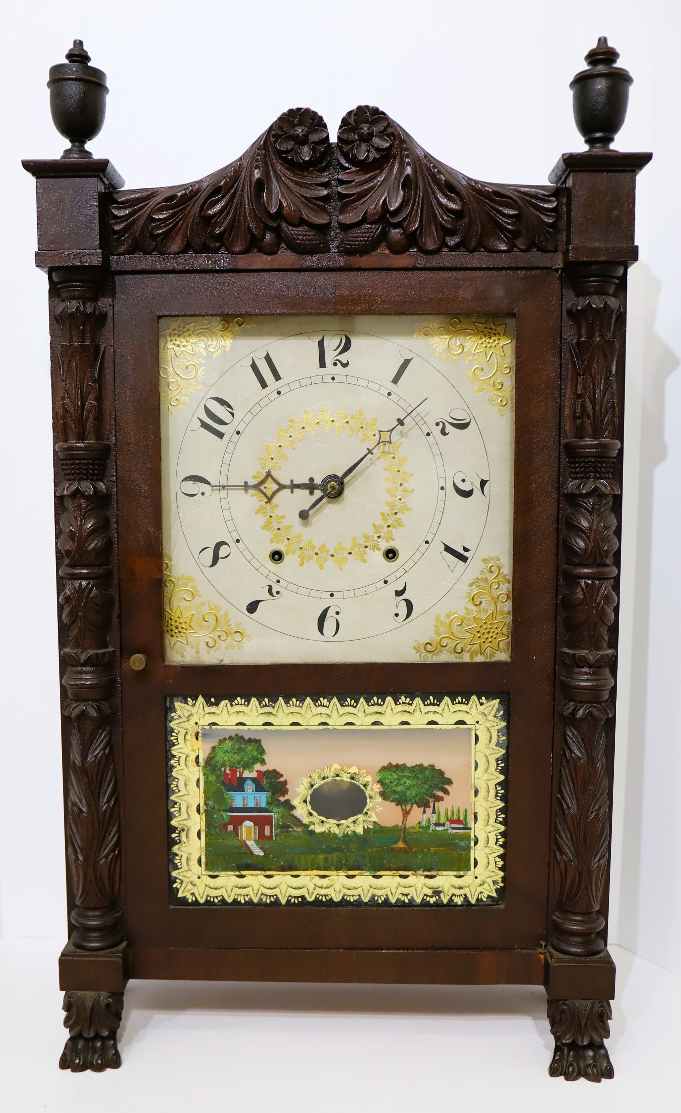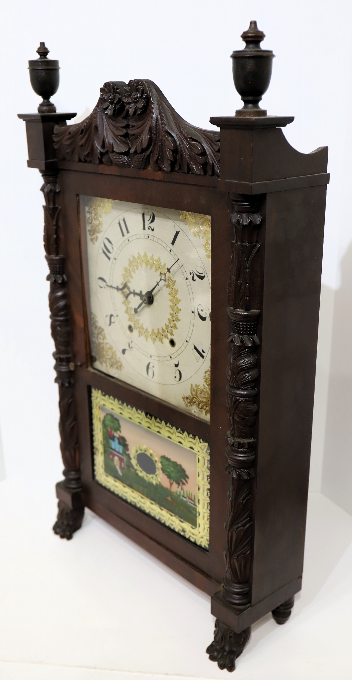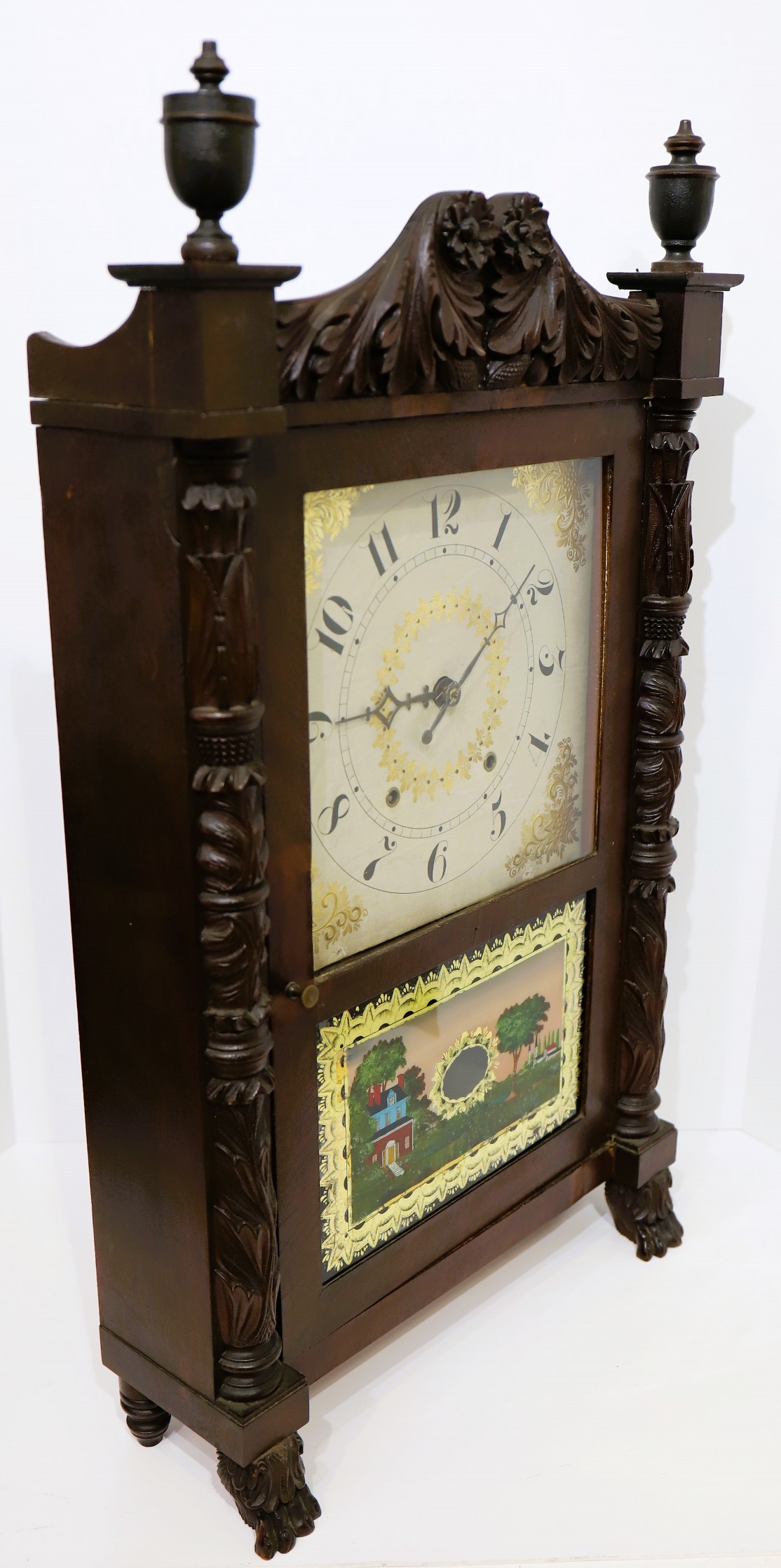 examples of this style. The 31-inch case has deeply carved half-columns and splat with wooden urns as finials. The finish