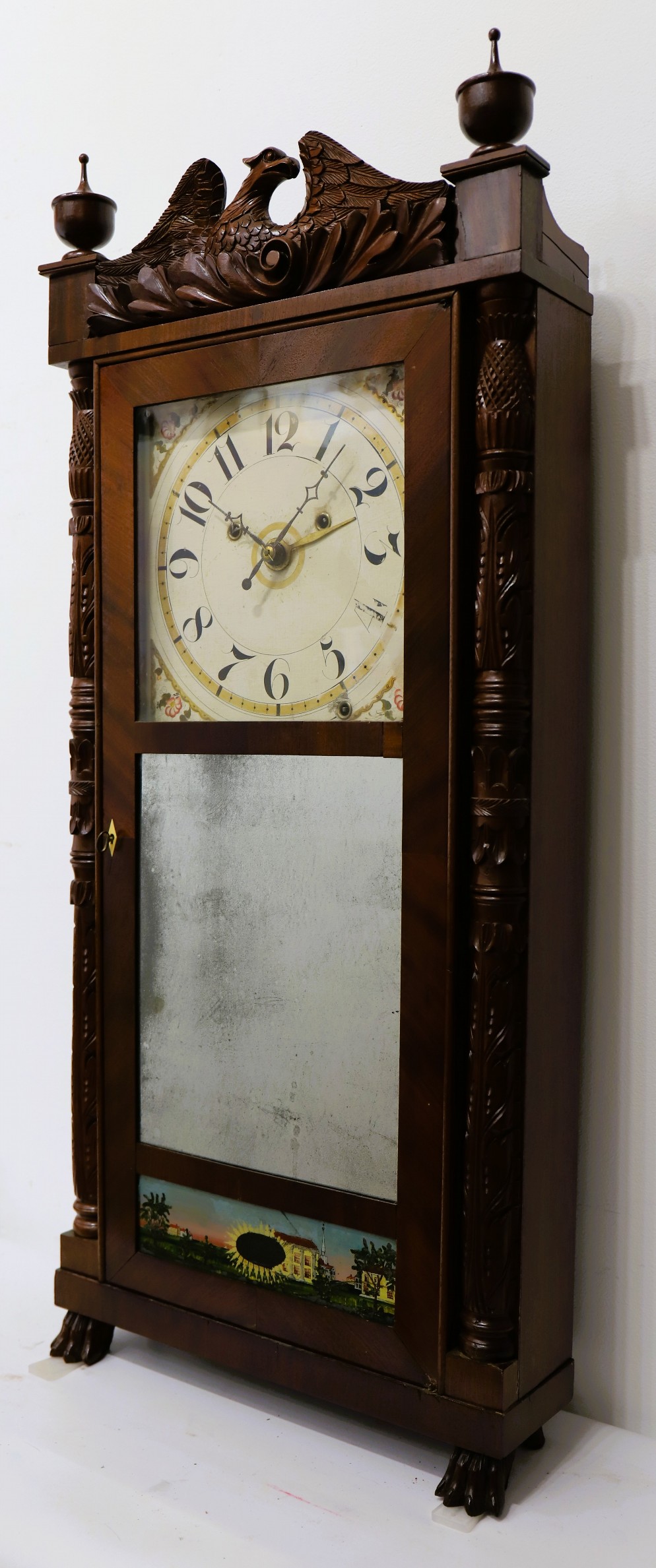 clock is 37.5 inches tall with carved columns, a carved eagle splat (with a reglued wing), and mahogany veneer, standing on small
