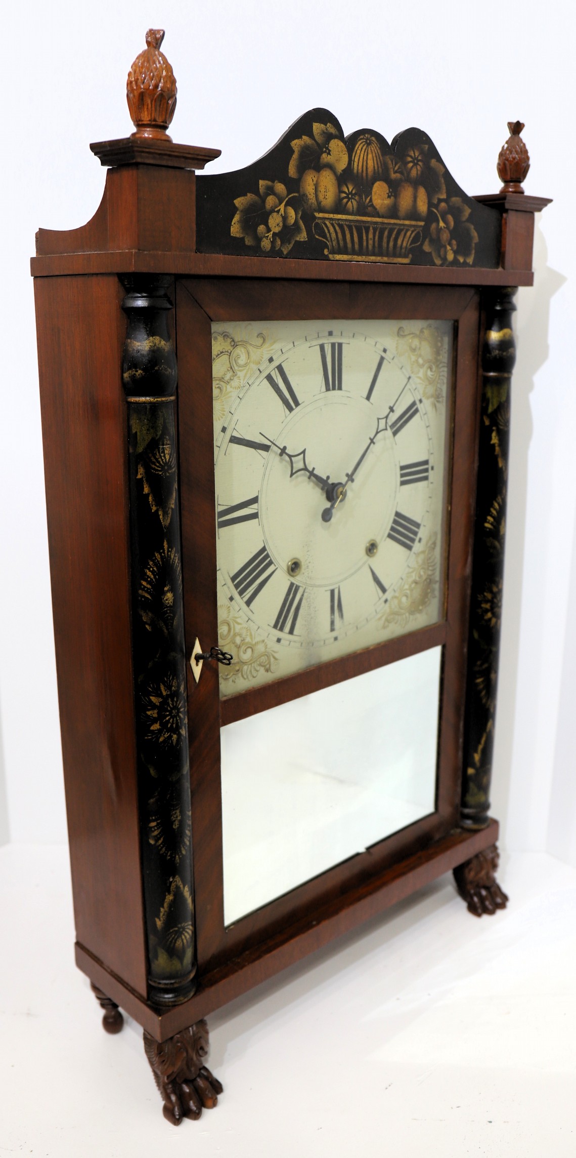 shelf clock, 1827-1832. A 30-inch clock on paw feet with bronzed half-columns and splat. I suspect the pineapple finials