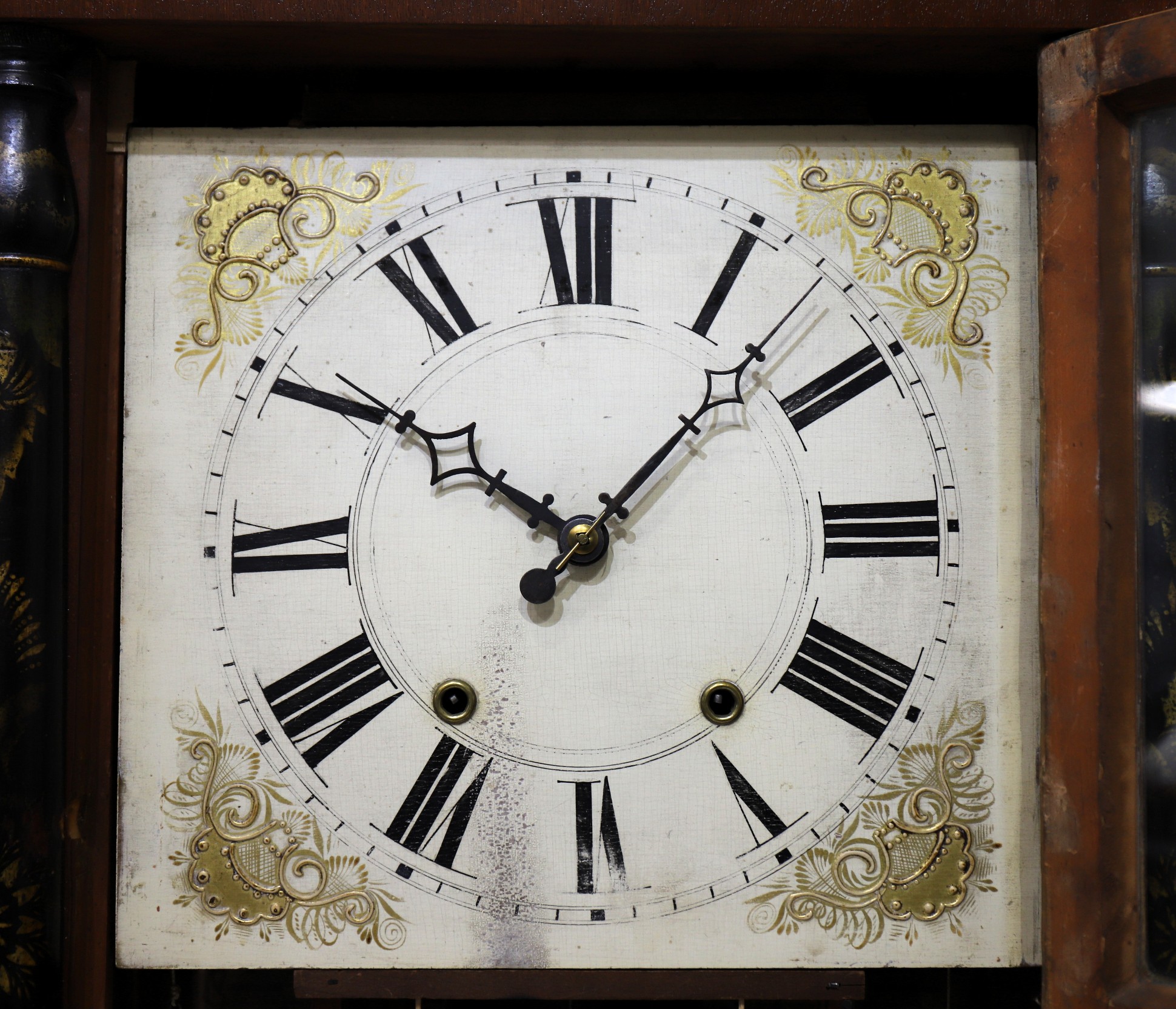 not necessarily original. The wooden dial has dark numbering and a clean background, with some discoloration of indeterminate