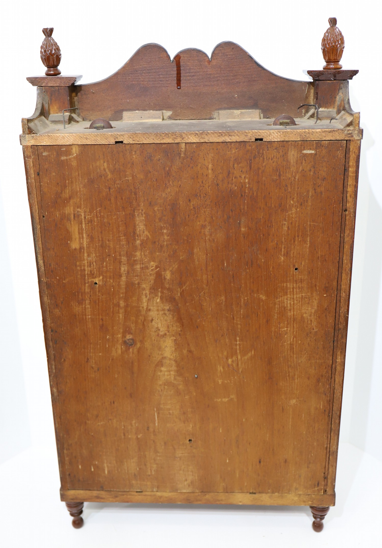 origin on the lower left. The wooden 30-hour time-and-strike movement will run for a bit and will strike on the iron bell. There are two period weights, an old pendulum bob, and a good label inside. Pillar & scrolls are more common from this Bristol