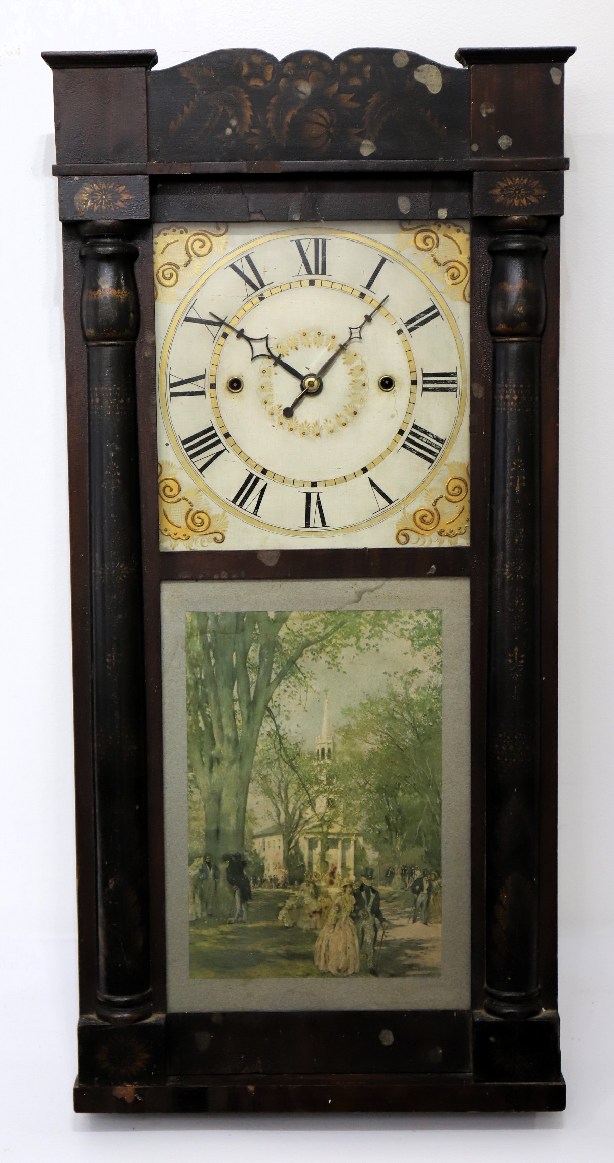 but should be a mirror – after all, it is a looking glass clock, one of the first. The wooden dial is clean with little wear;