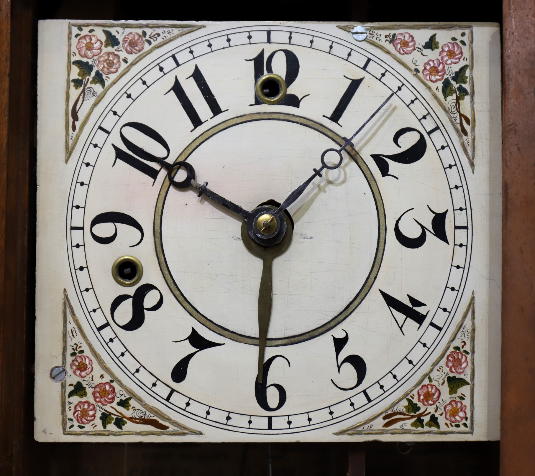 wooden dial has been repainted, the hands are mismatched, and the alarm hand is a modern piece and is not fitted to the wooden