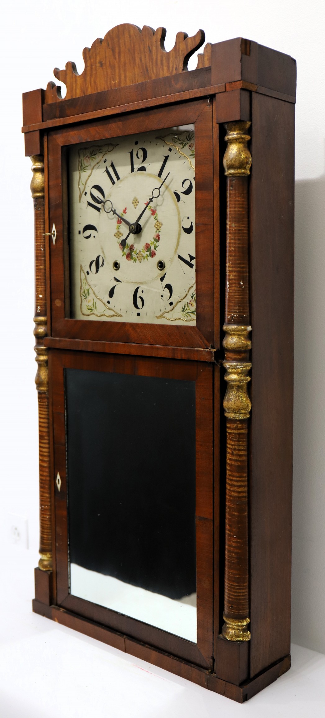 columns are gesso covered and grain-painted, with gilded caps and plinths. It all looks original with light chipping and wear. The dial glass may be original, the mirror wavy but clearly resilvered. The wooden dial is clean with colorful strawberries