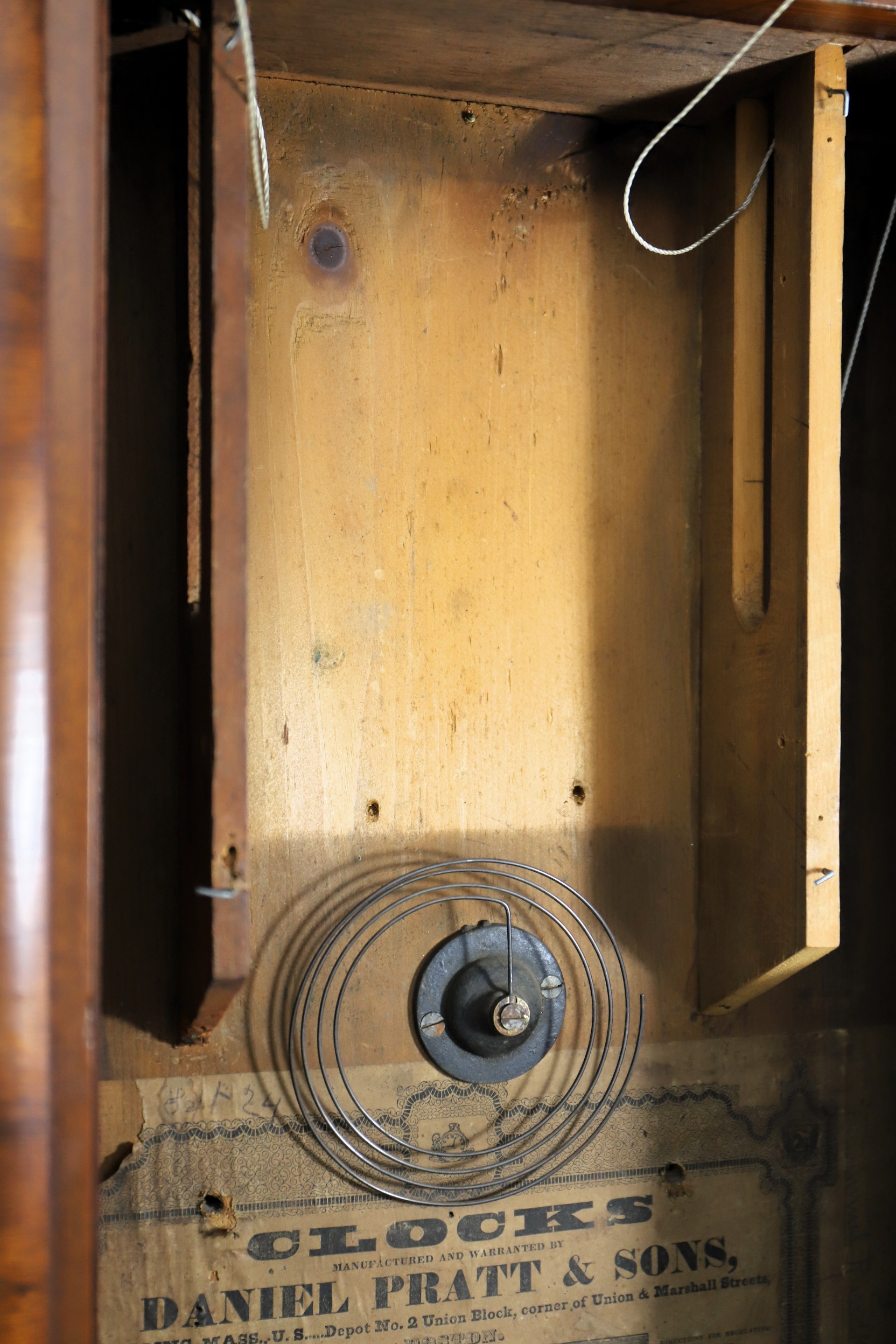 Daniel Pratt & Sons 30-hour shelf clock, 1852-1871. The label in the clock is incongruous with the wood movement; Pratt & Sons were clockmakers and retailers in the second half of