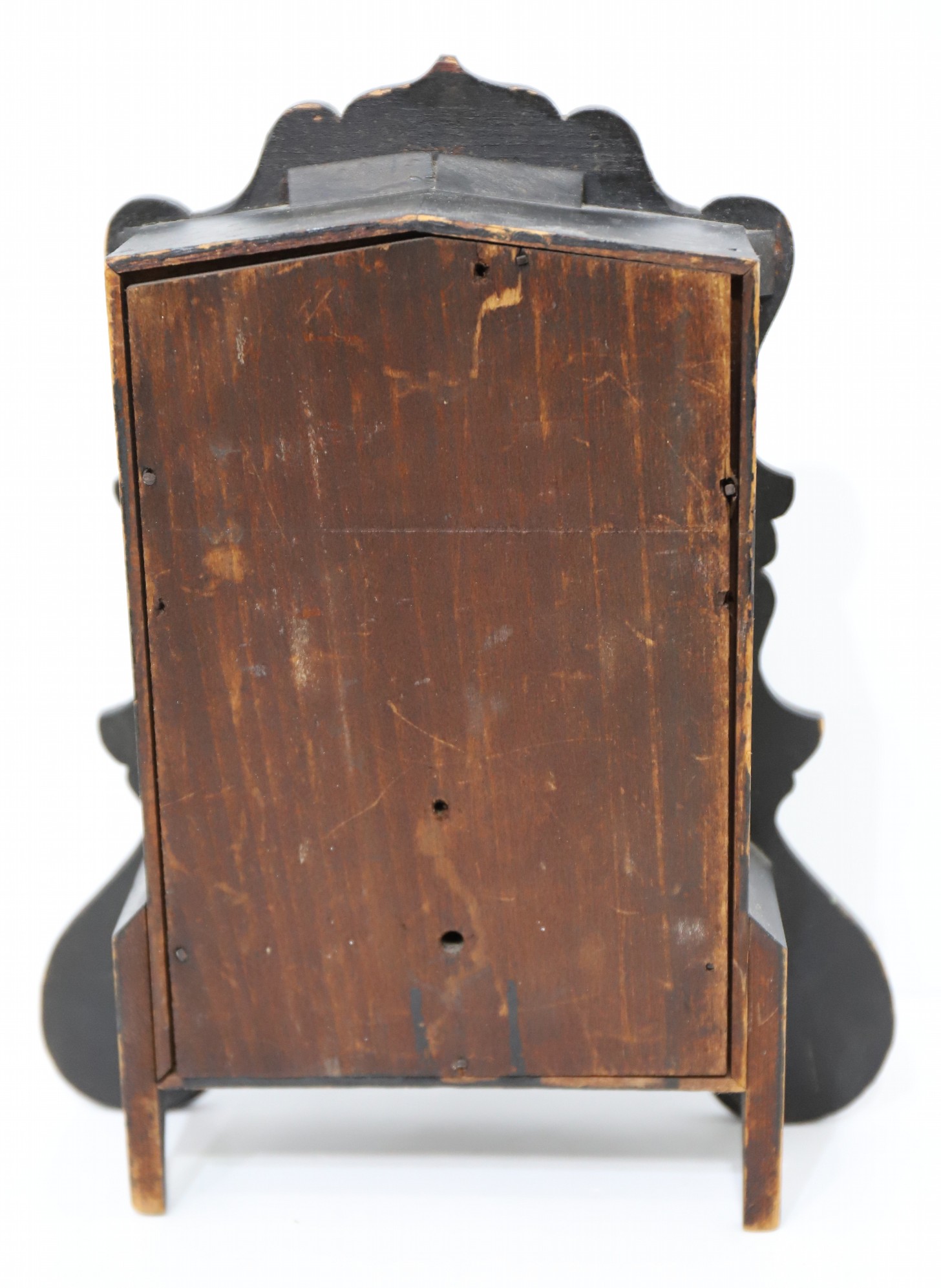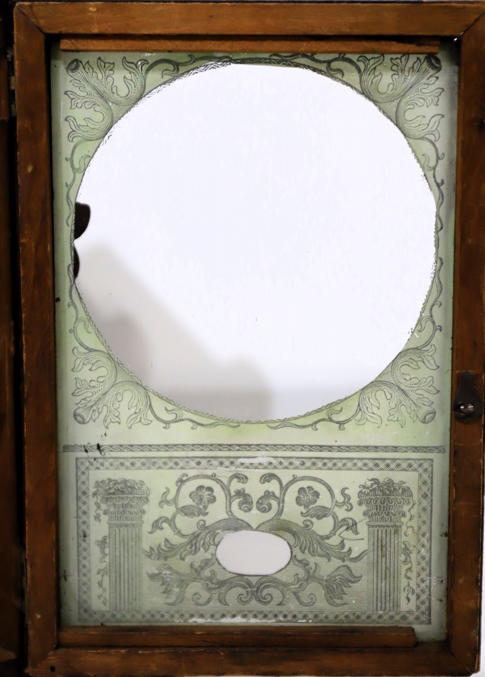 1852-1854. An 11.5-inch case with walnut veneer and an original glass with a well-preserved black stencil and green backing. The dirty, faded, and chipped metal dial has the original paint and is faintly signed "Brewster Mfg Co. Bristol CT". Brewster