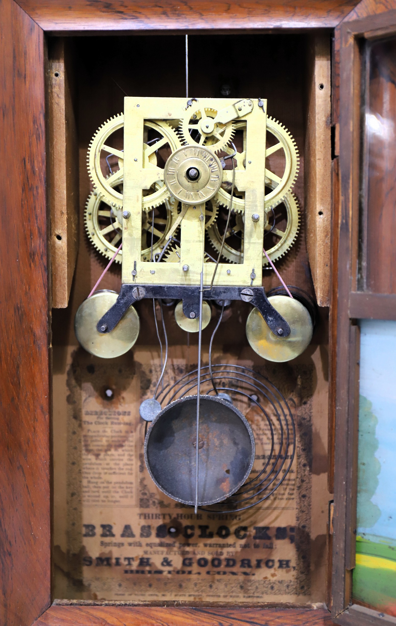 it is running and striking on the wire gong. The alarm was not tested; it strikes on an iron bell mounted above the gong. The