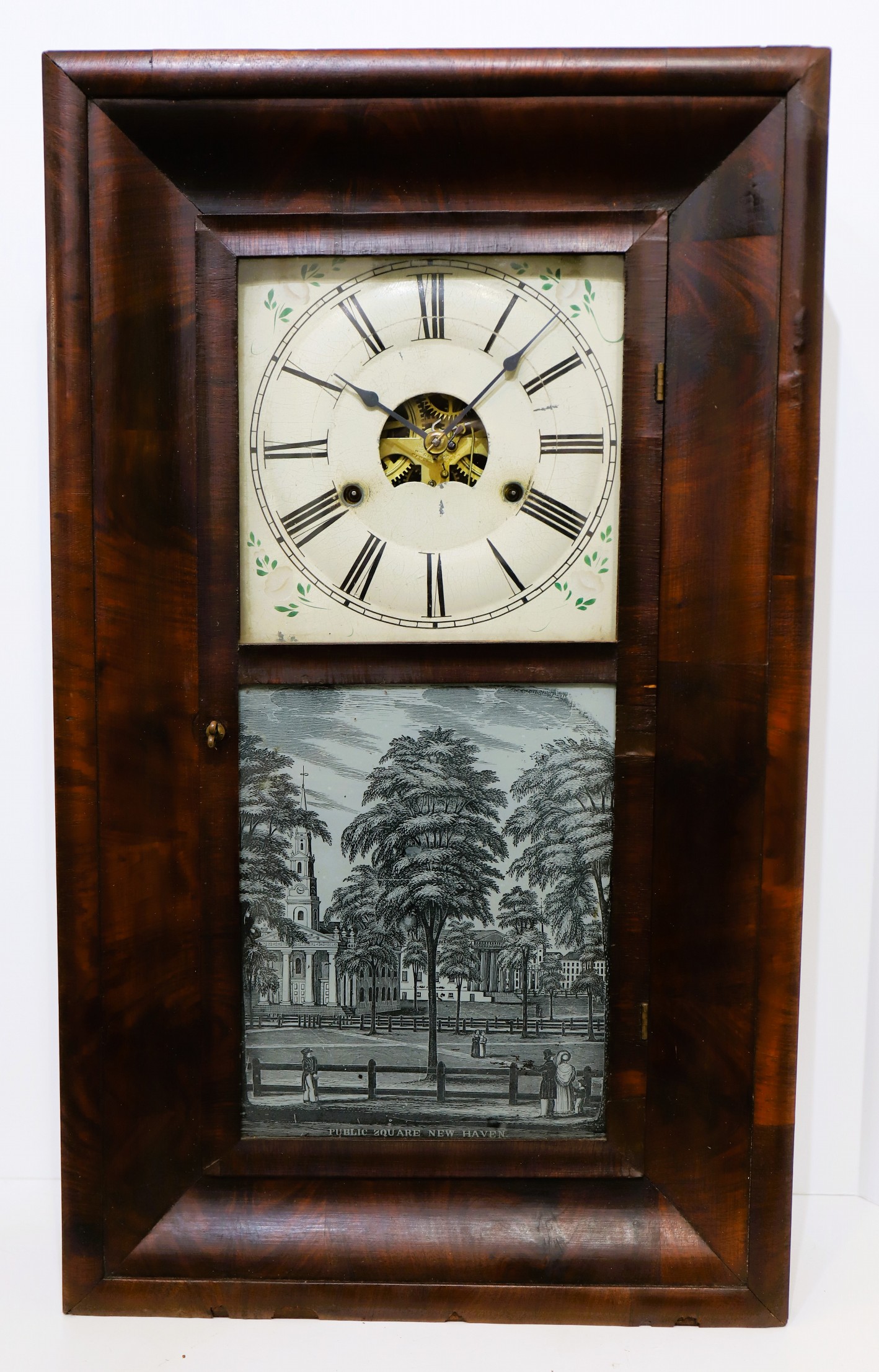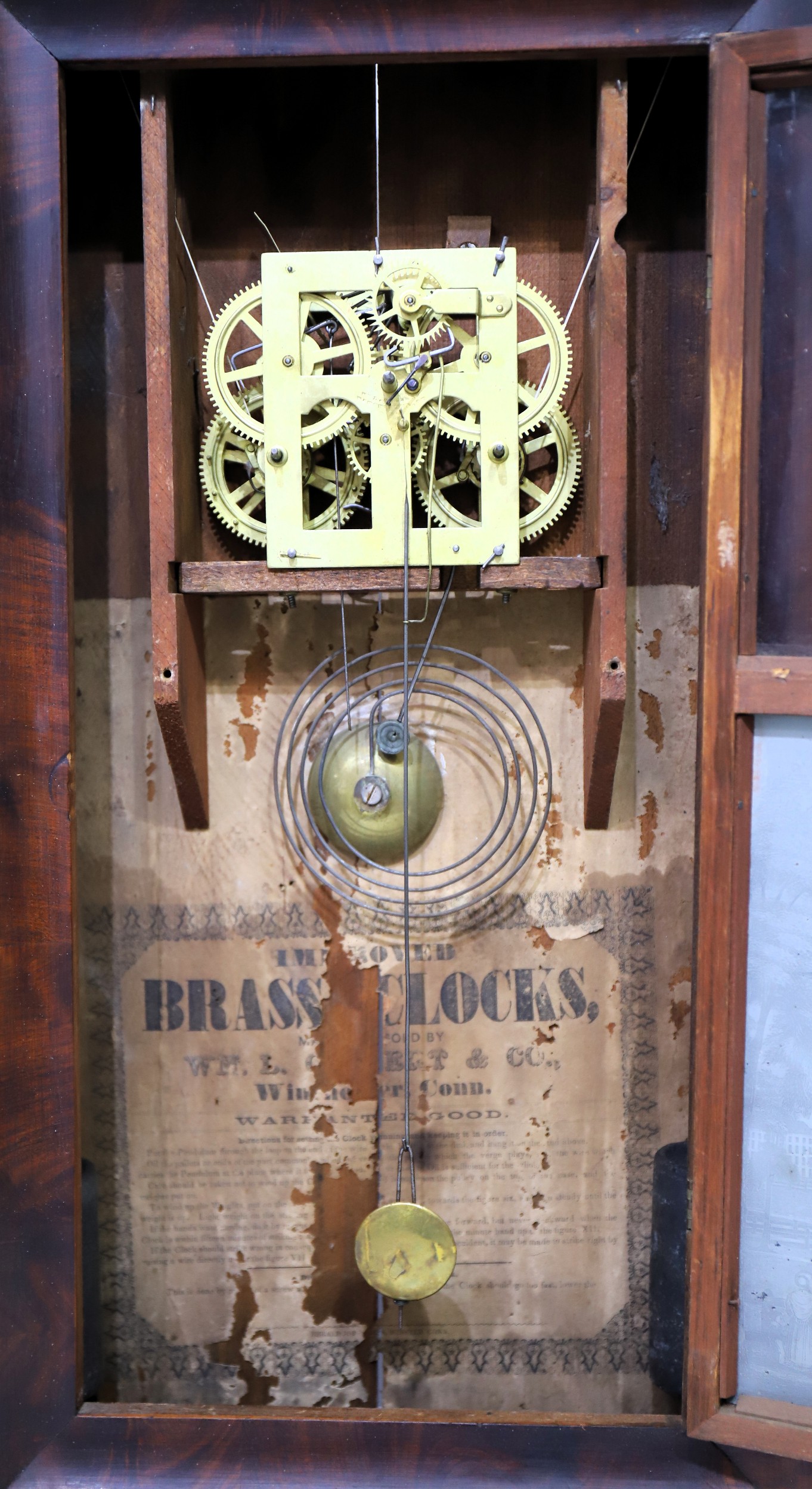 Wm L Gilbert & Co. 30-hour OG, 1851-1866. A 26-inch OG case with great flame mahogany veneer and a clean finish and just a few chips along the bottom. Both glasses are
