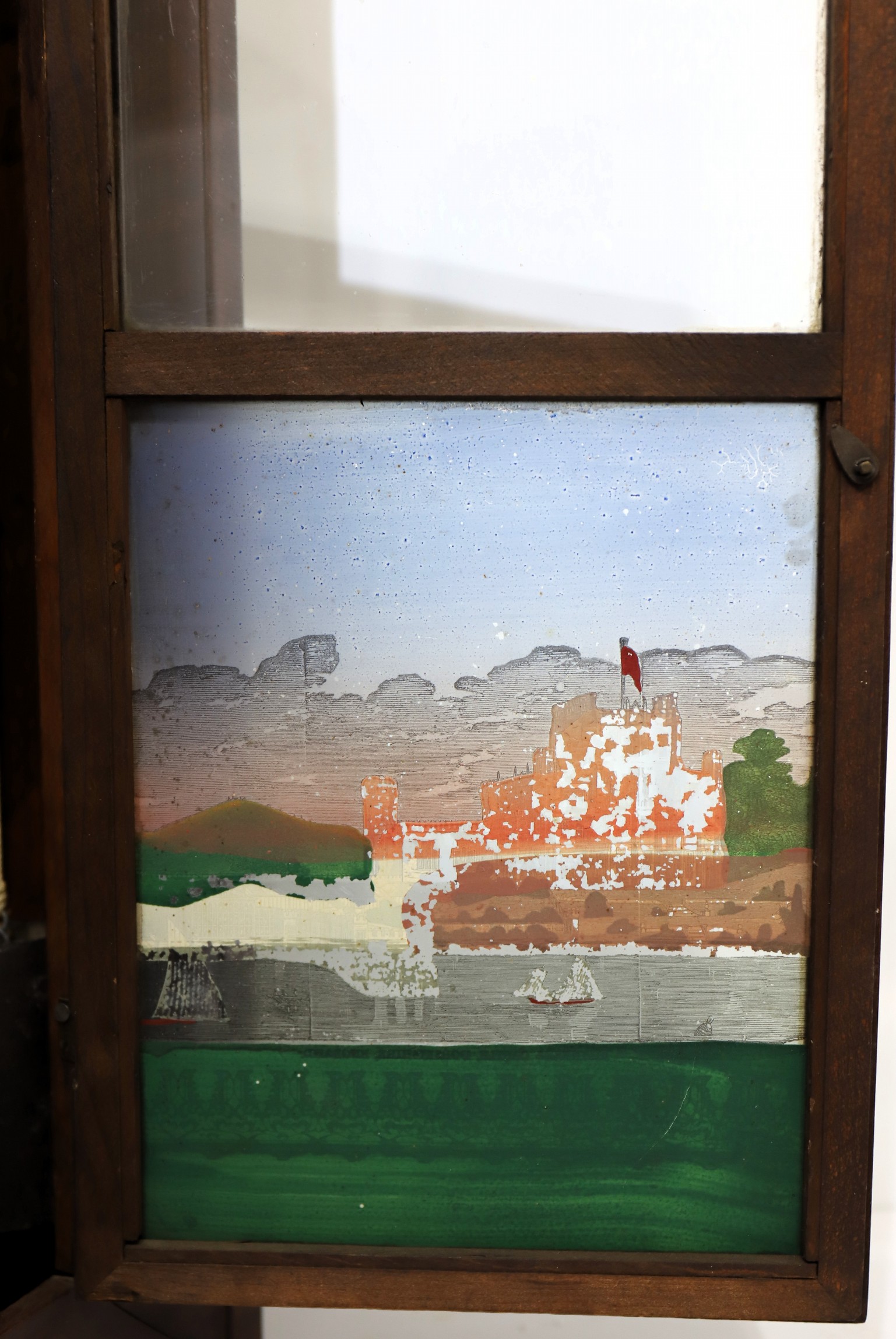 movement is unsigned, dirty, but running and striking on a wire gong. There are two period weights, a bob, and a decent label