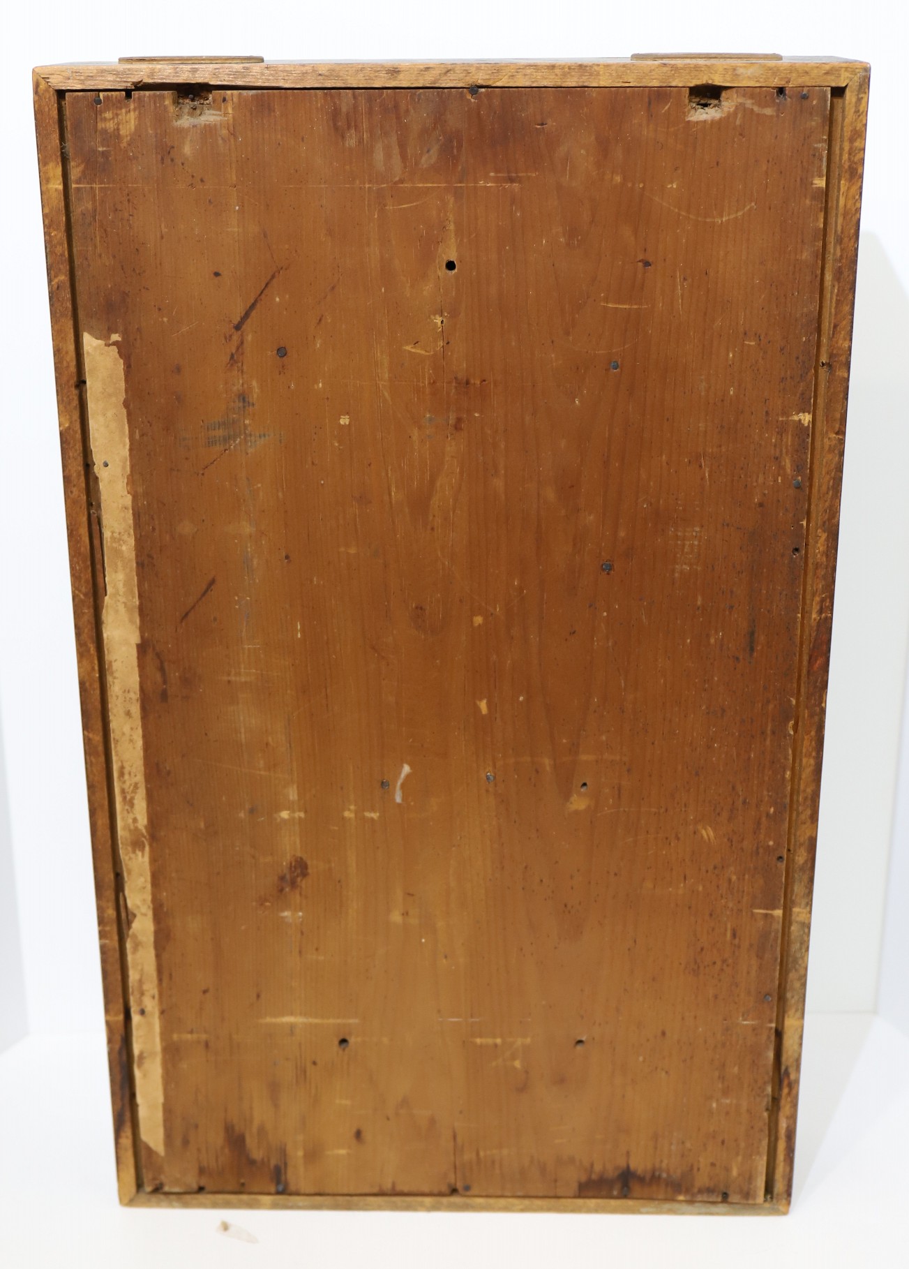 has a beautiful finish, with an original dial glass and a modern replacement lower glass and atypical tablet, backed in black. Striking, if not authentic. The contoured brass dial is polished, lacquered, and the numbering is strong, the hands appropriate. BM&Co used strap-brass movements and that is true here even for this small, 30-hour, weight-driven, time-and-strike movement. It is die-stamped BM&Co. I could not test it as the weight cords are missing, but I expect this clean movement to run. There are two period weights and an embossed brass pendulum bob, with a good label on the interior back wall. A quick check