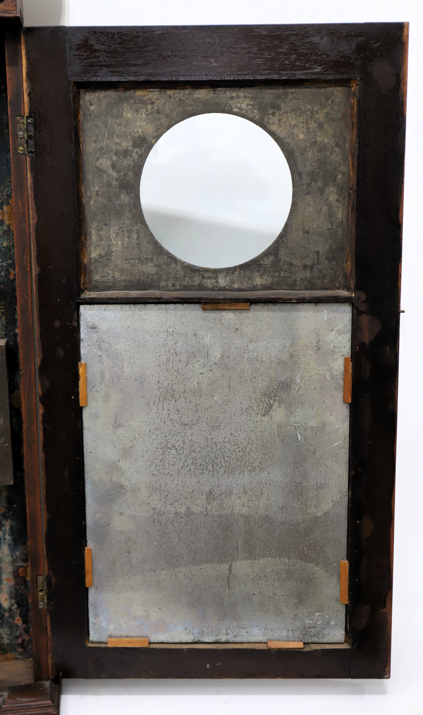 veneer above the dial. Note the rosettes in the corners and the carved half-columns flanking the mirror; the case has been