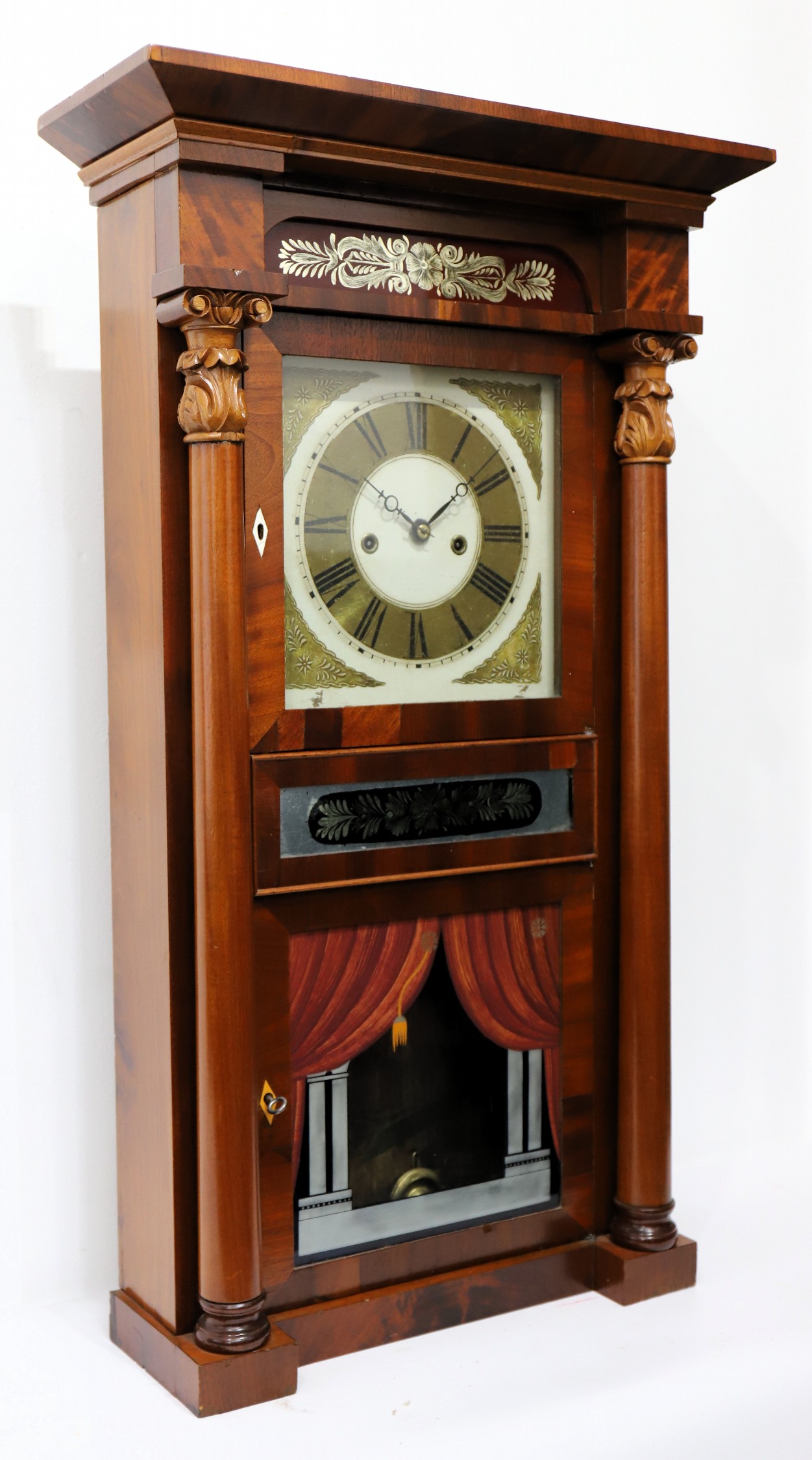 second example, this one with considerable restoration. The refinished case is 35 inches tall with burl panels, full columns,