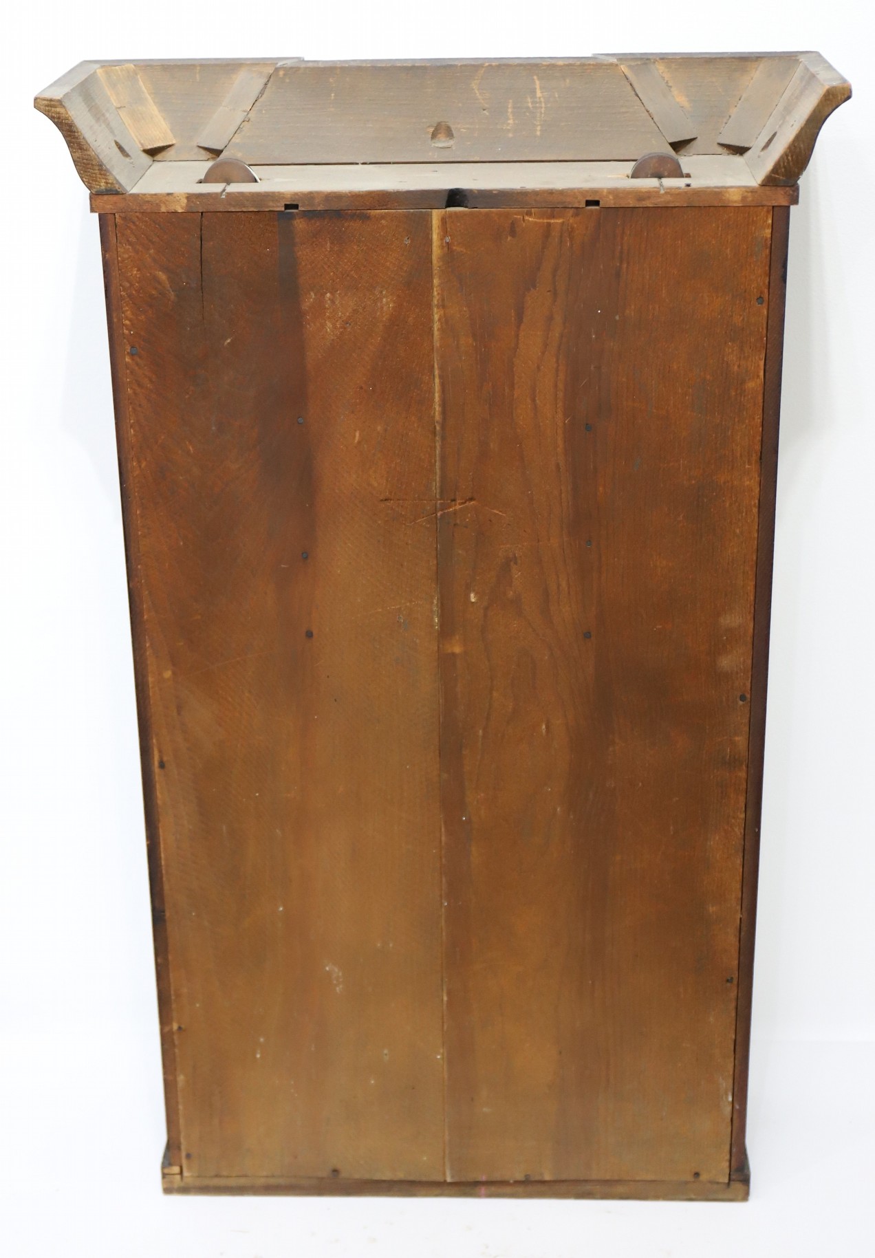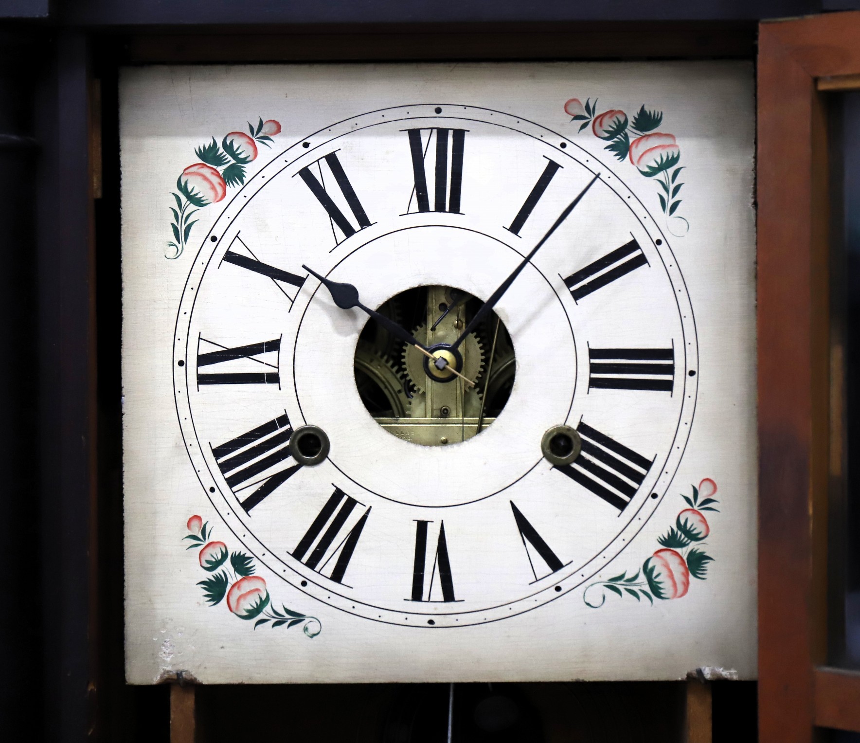 is signed and running, striking on a wire gong. There are two matching 8-day iron weights, an old pendulum bob, and good label