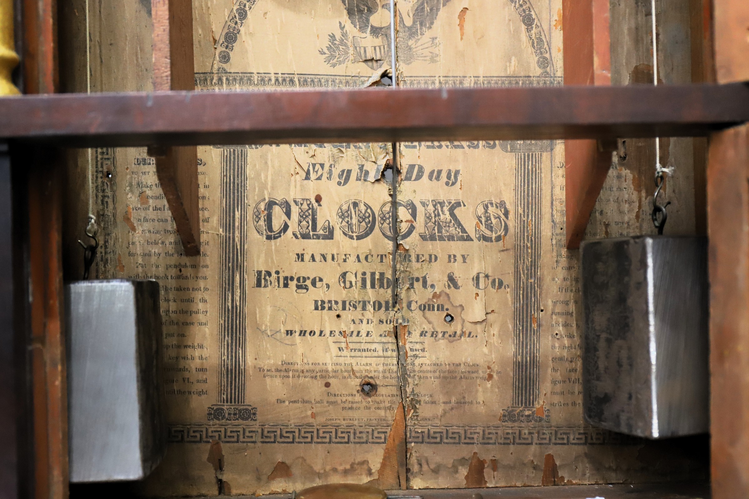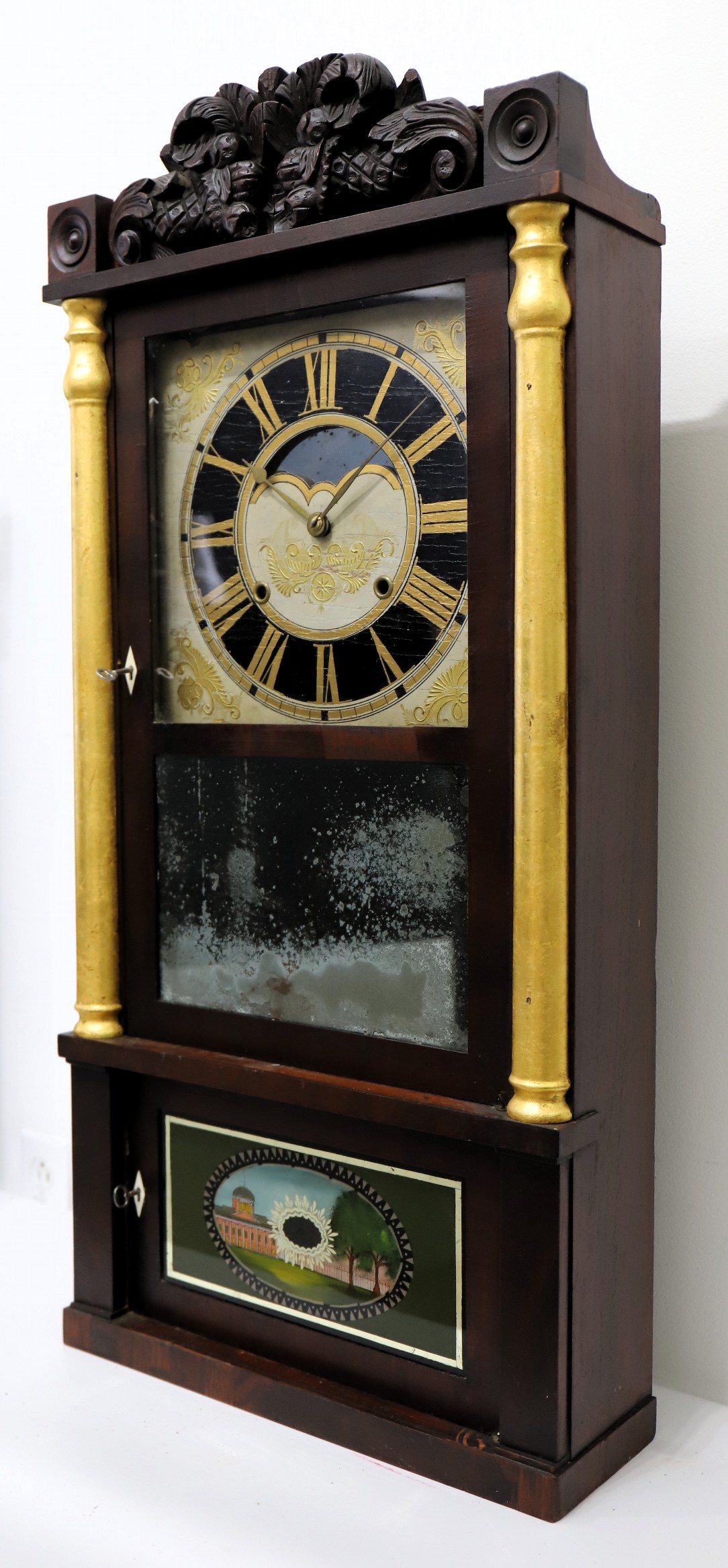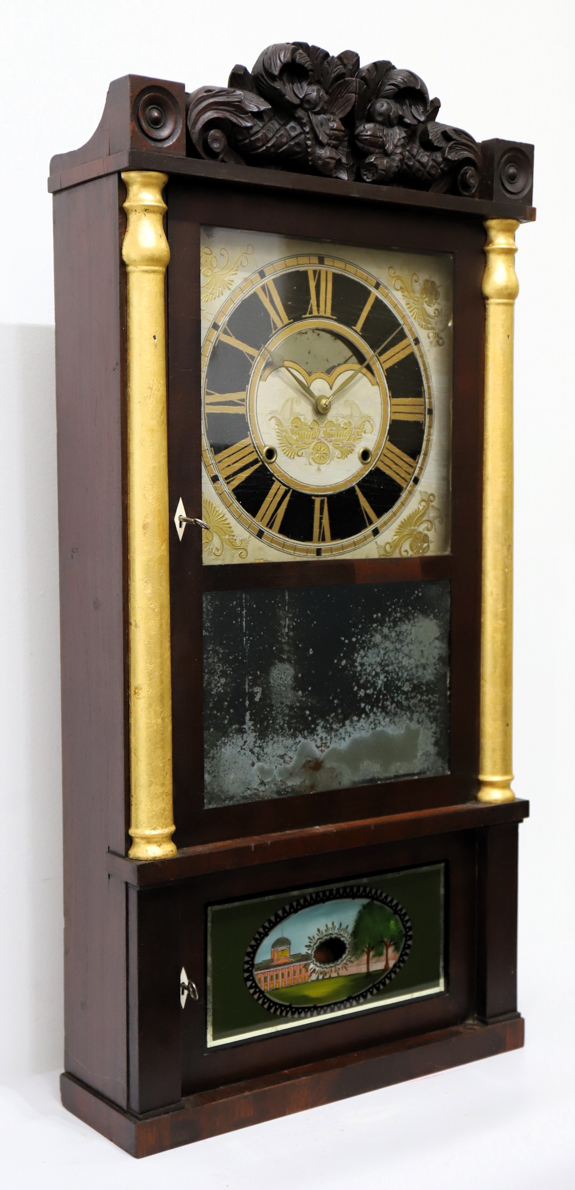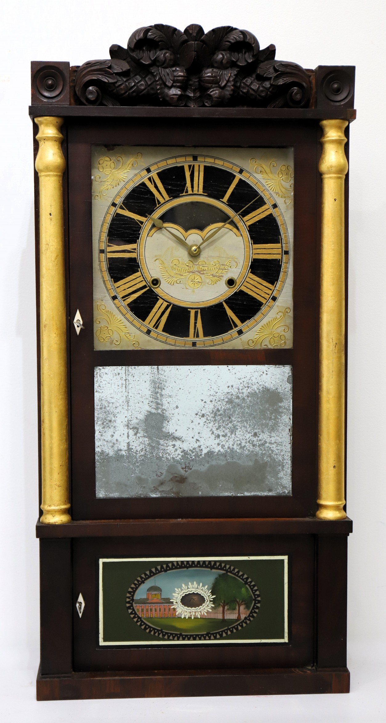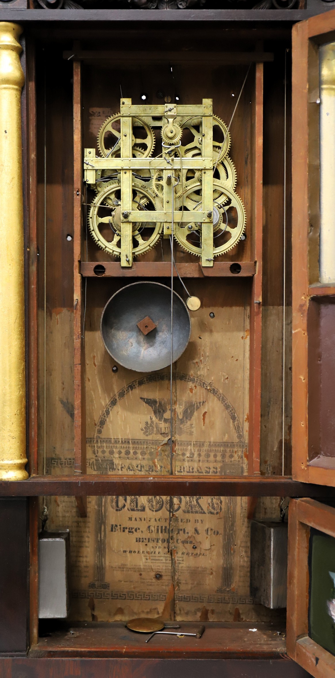 Birge, Gilbert & Co. Patent Brass Eight Day Clock, 1834-1837. A 35.5-inch-tall case with a dark finish over mahogany veneer. The carved splat is impressive, the half-columns have been painted