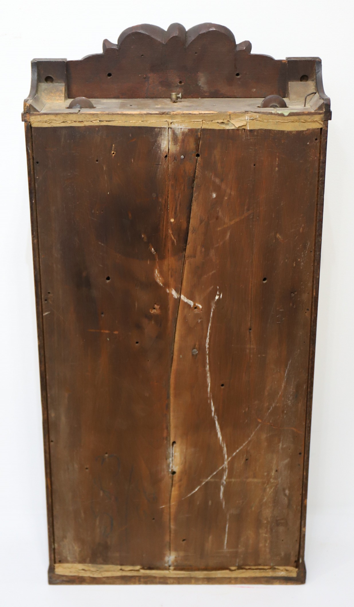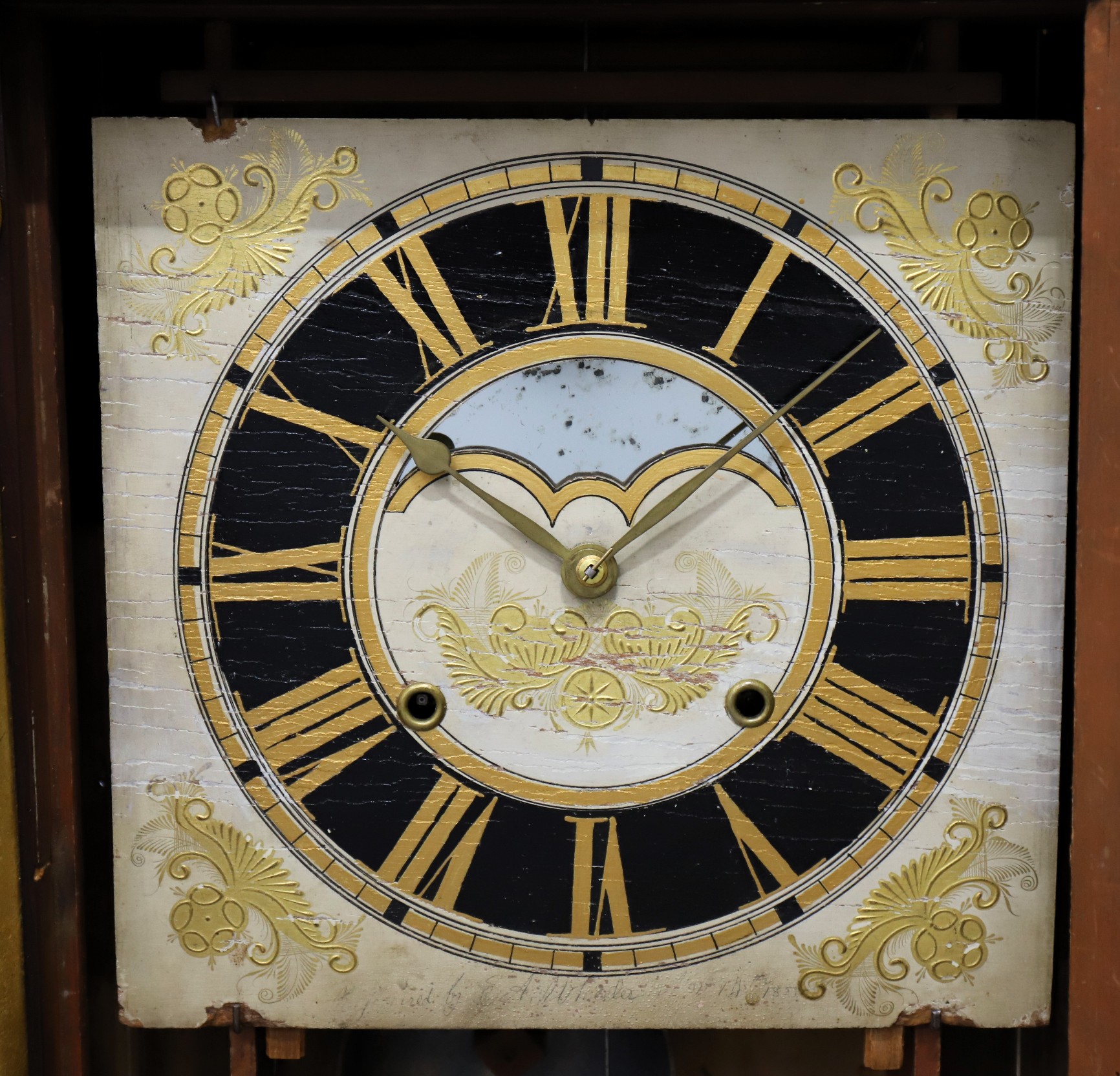 with a wire through the top to allow you to lift the mirror to view the “modern” brass movement. The dial mirror is a period