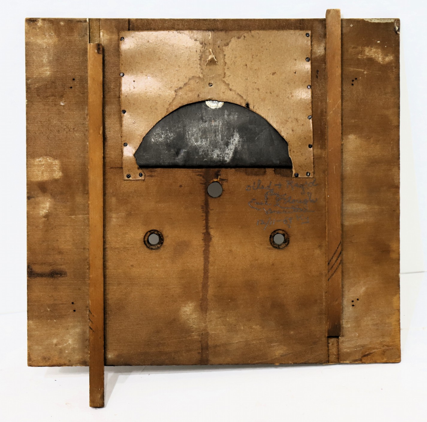 are period. The 8-day, time-and-strike, weight-driven, strap-brass movement is unsigned; it will run but the strike is sluggish,