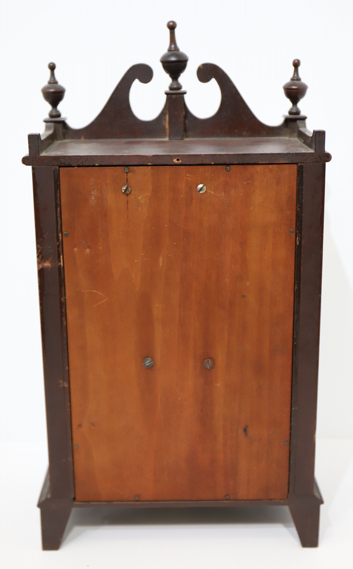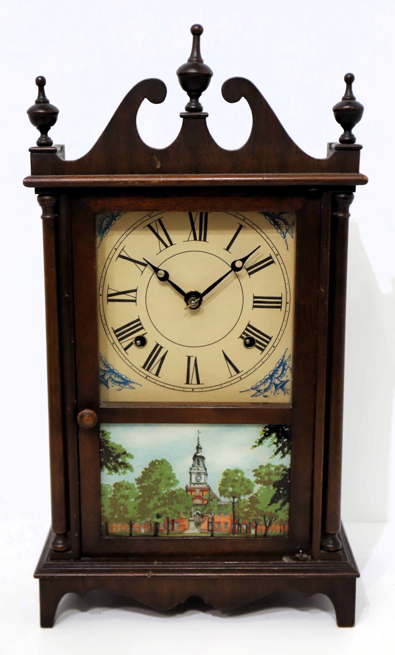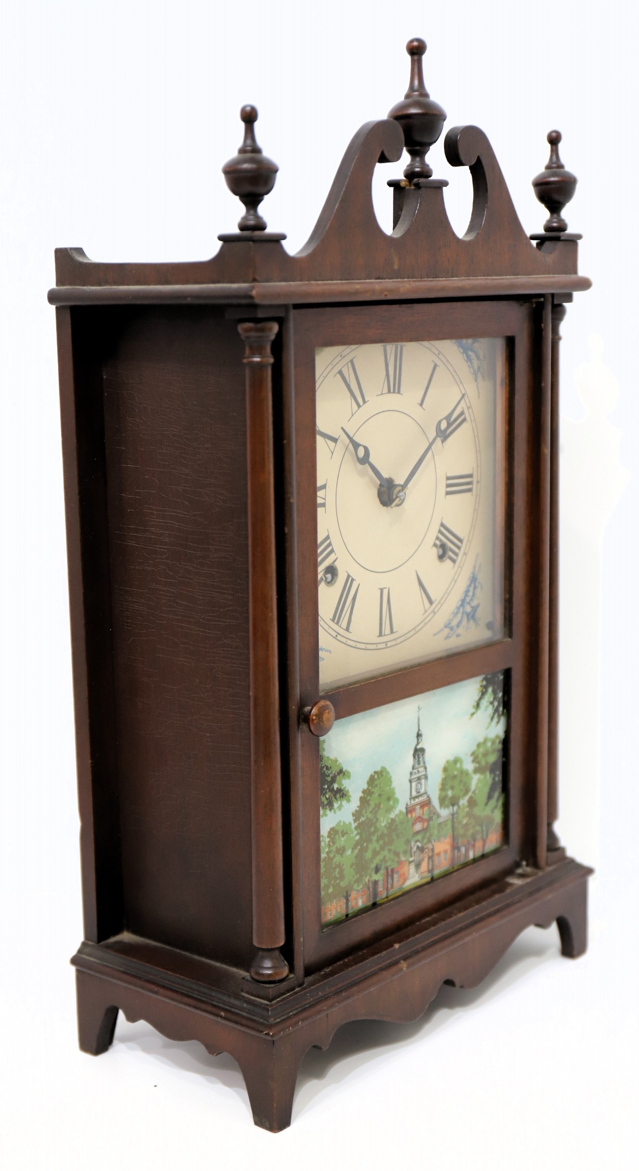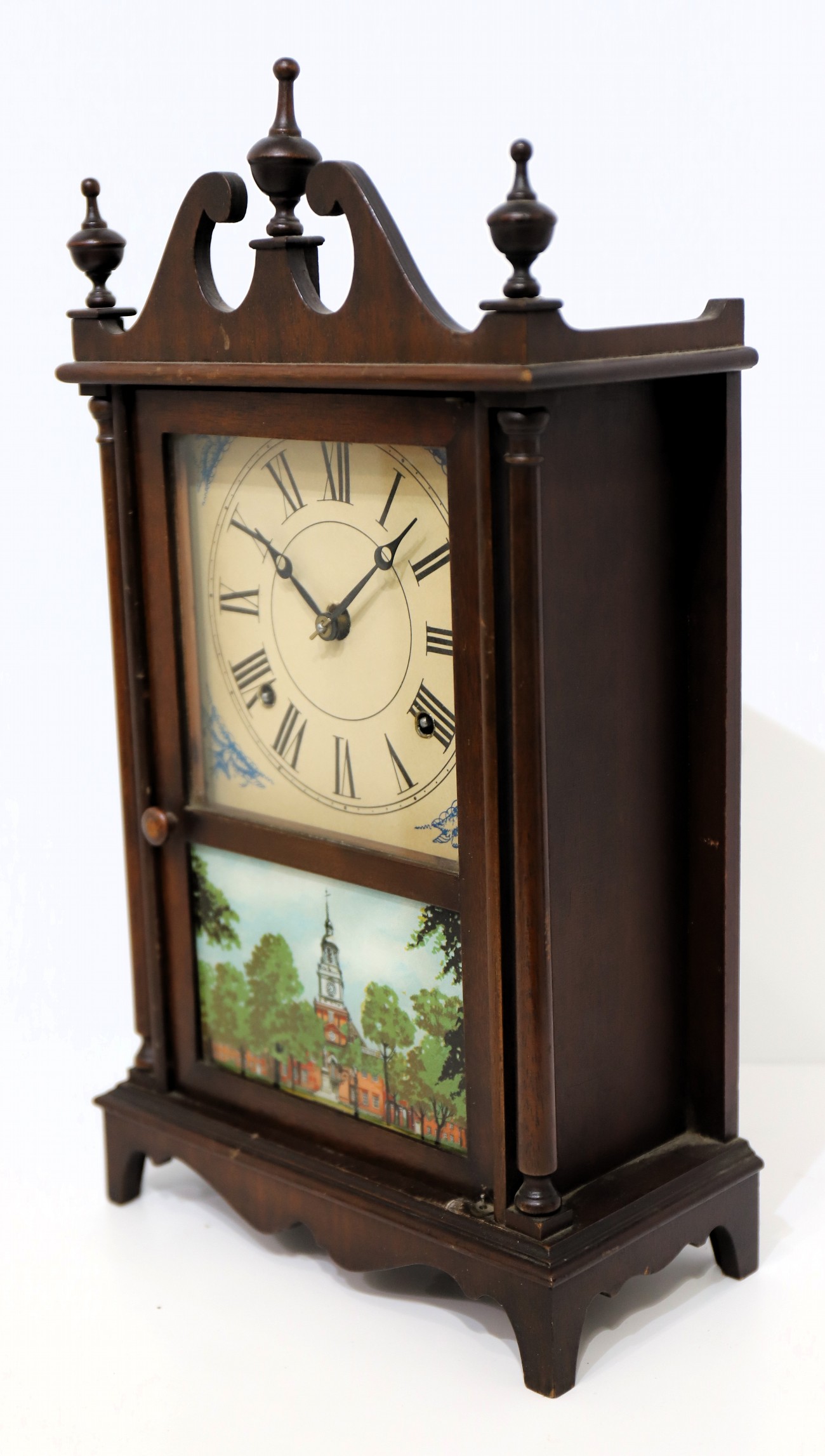 (with wooden finials) closely matches the catalog illustration for this model shown in Ly, Sessions Clocks on page 239. However,