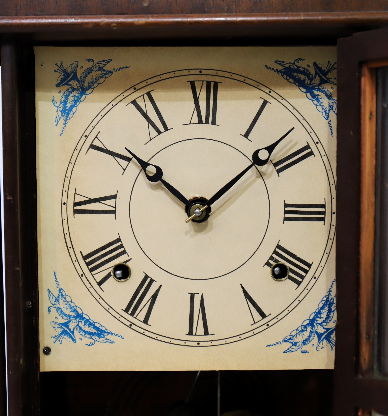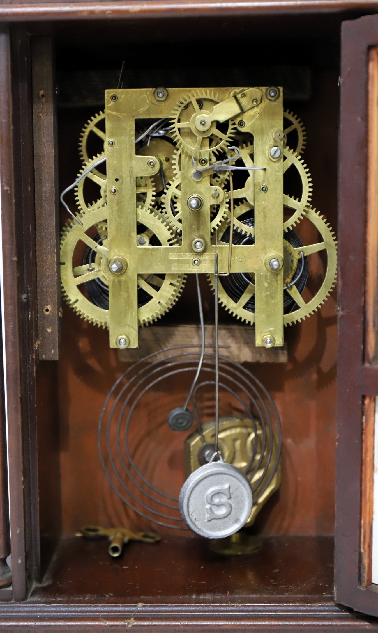 the movement here is a Gilbert 8-day time-and-strike brass movement, replacing the Sessions 8-day time and half-hour strike movement