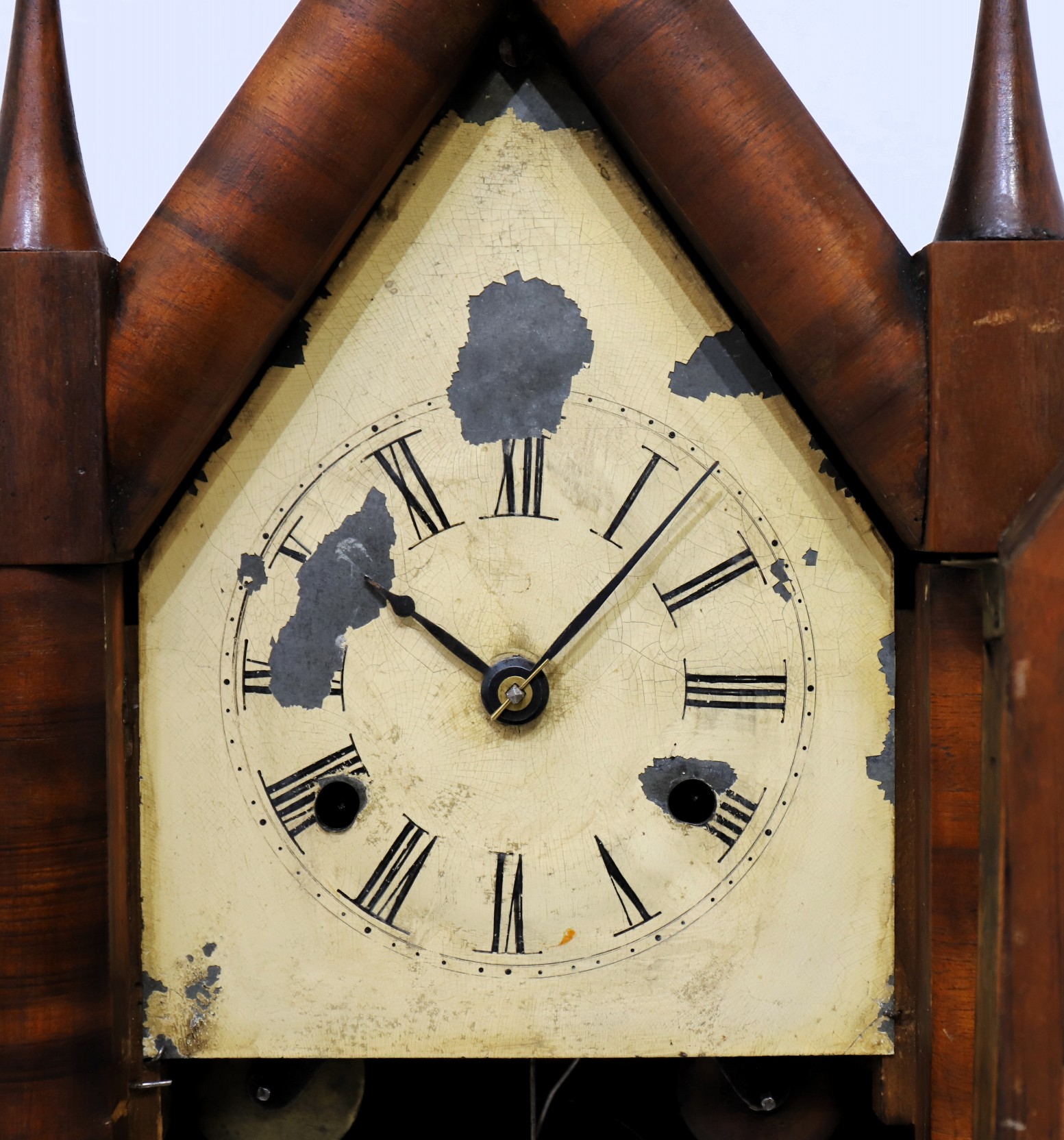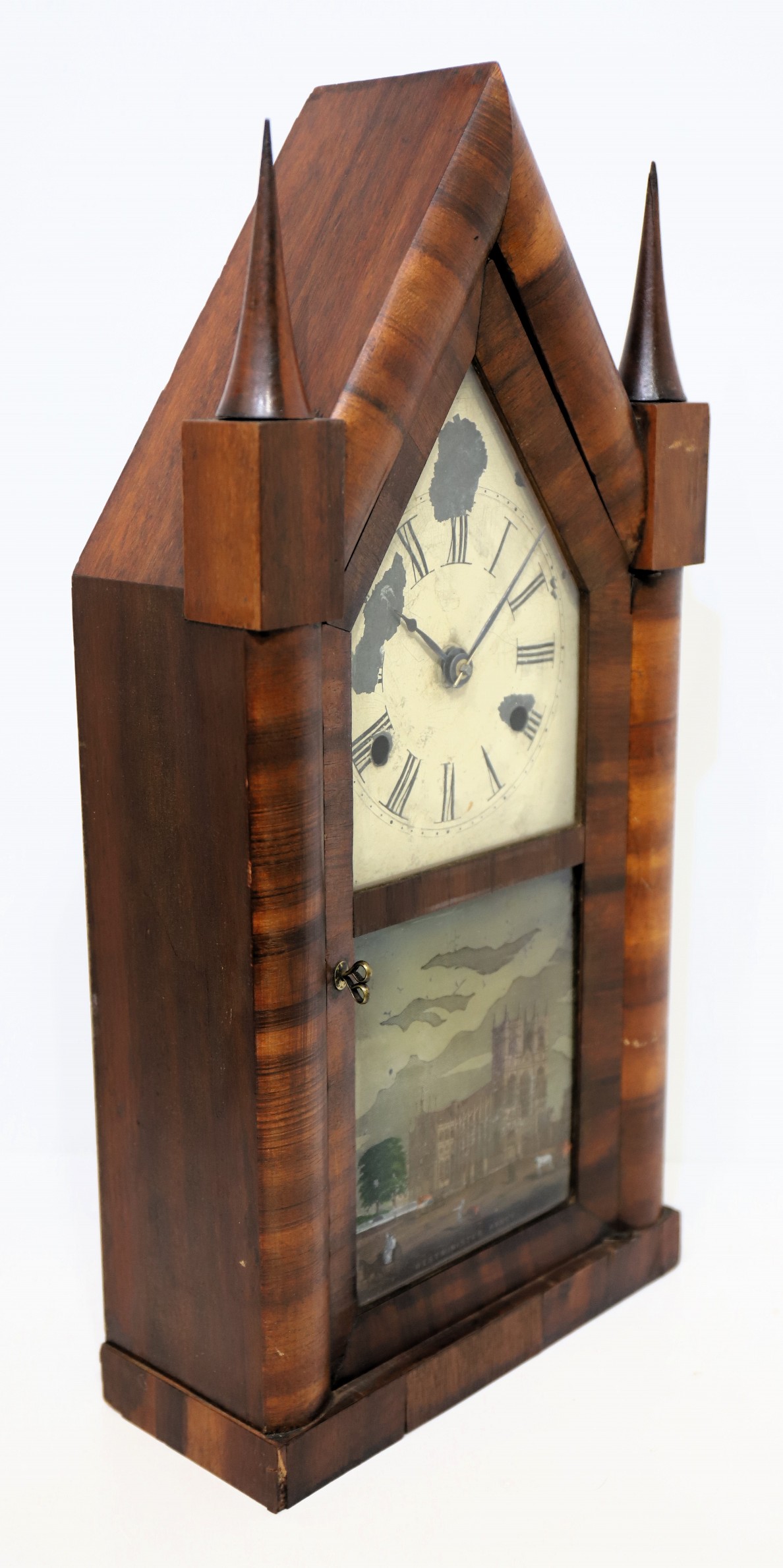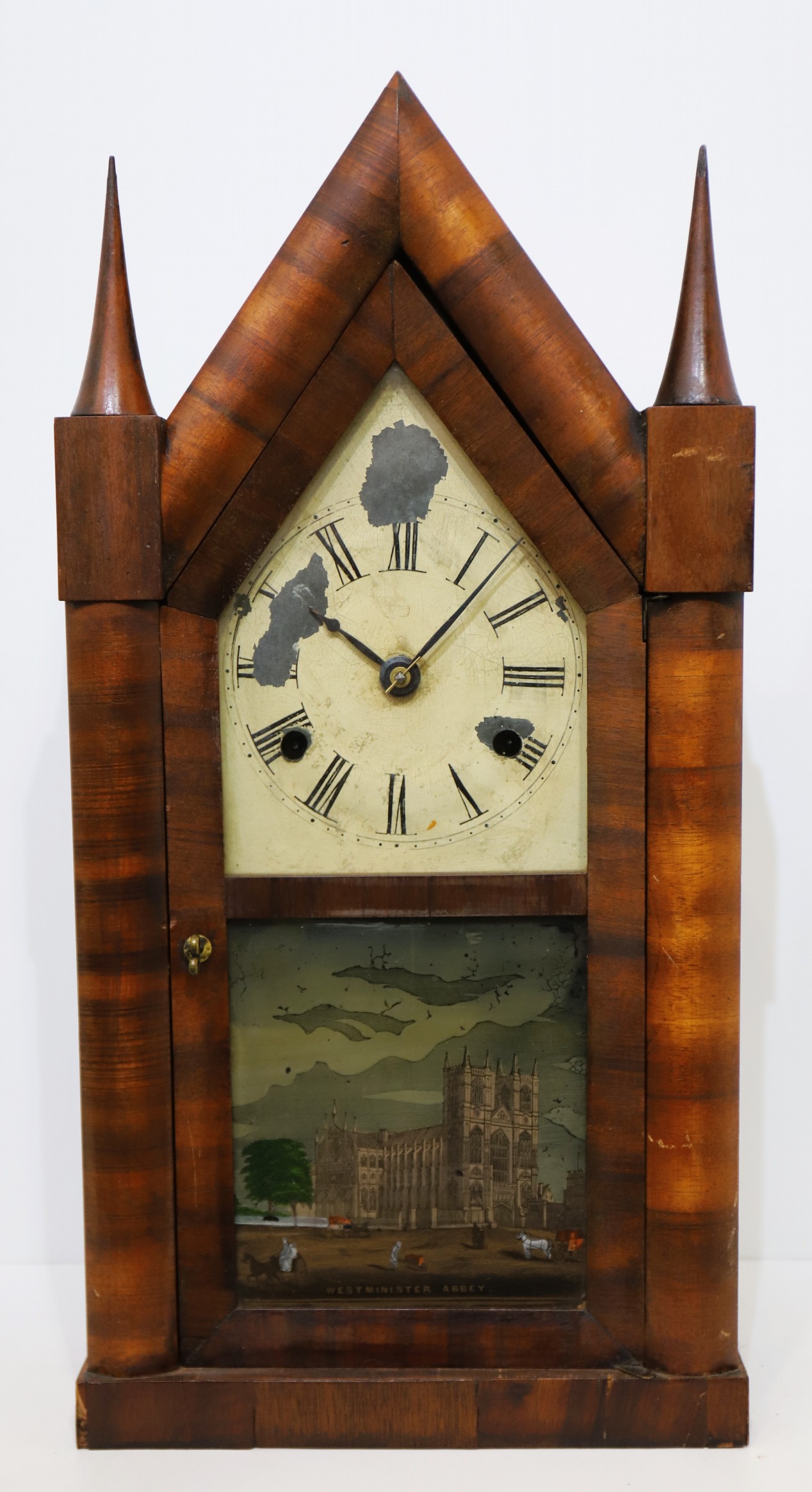 sharp gothic with good mahogany veneer and a clean finish. The cone finials are sharp, both glasses likely original, with a