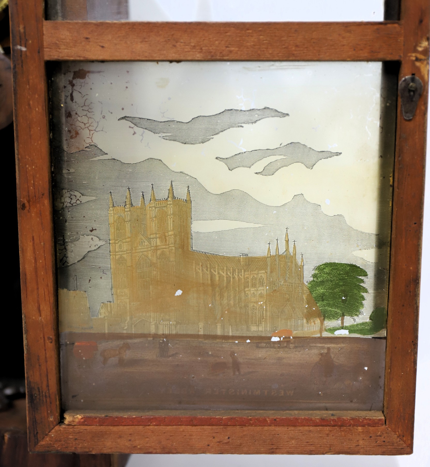good decalcomania transfer tablet of Westminster Abbey. The contoured metal dial is in poor condition with considerable losses