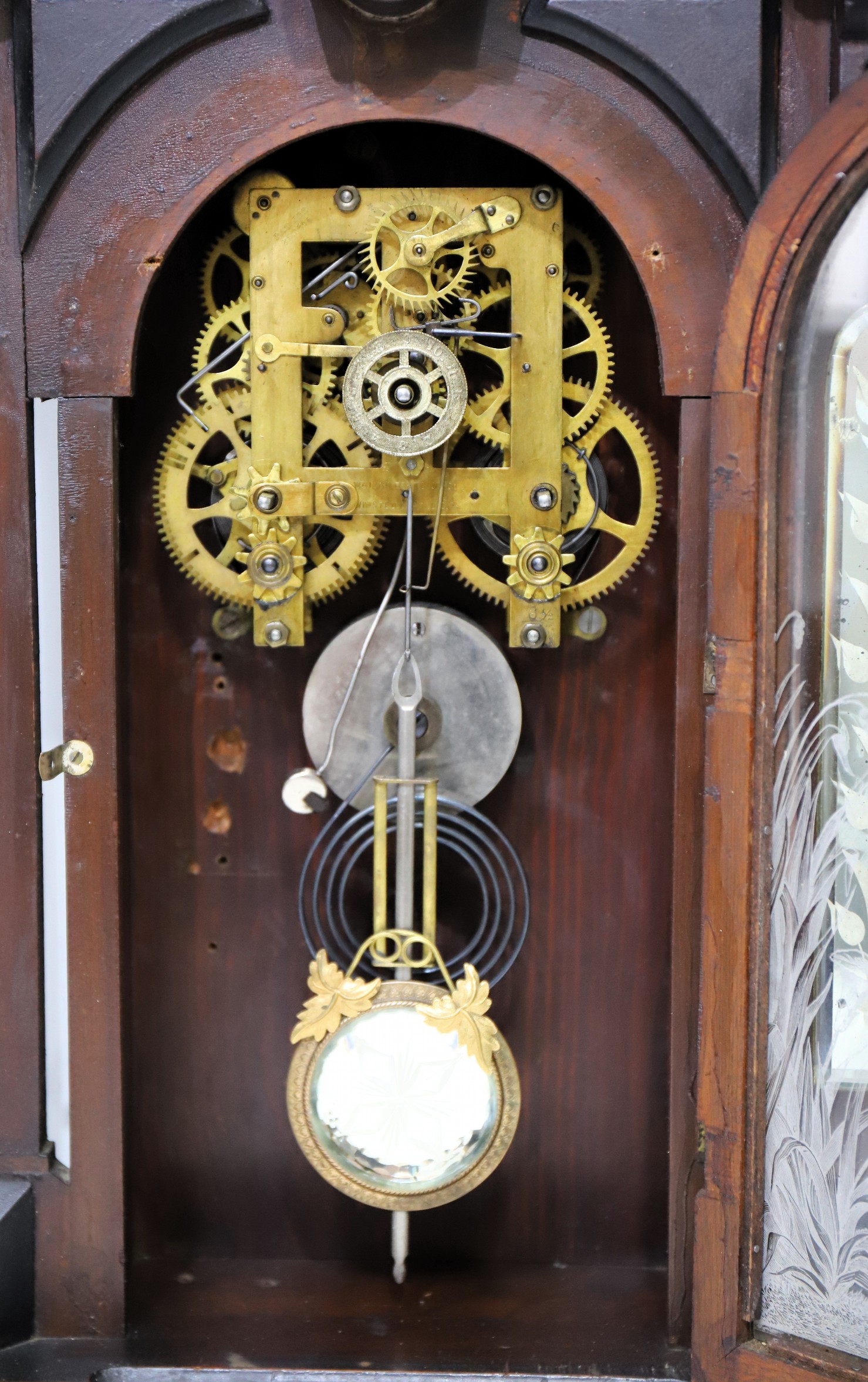 movement is signed and running, and striking on the cathedral gong, regulated by the mirrored, etched glass pendulum you expect to