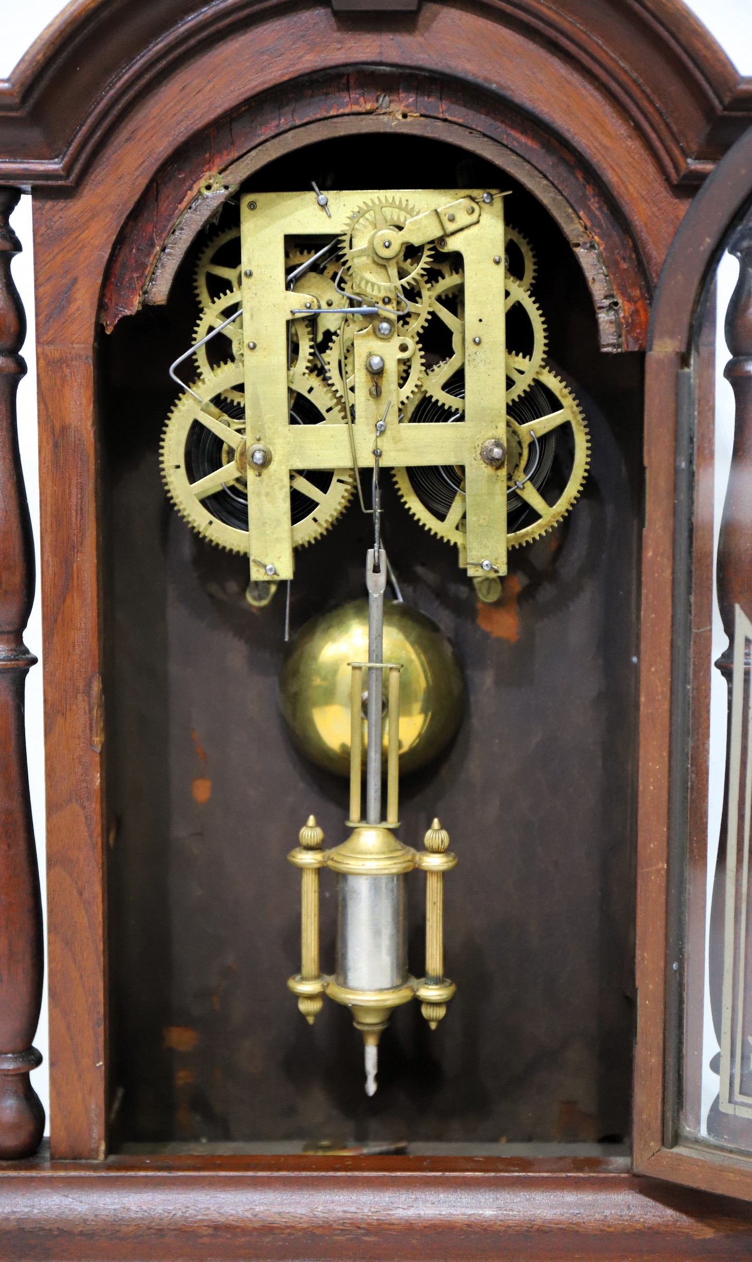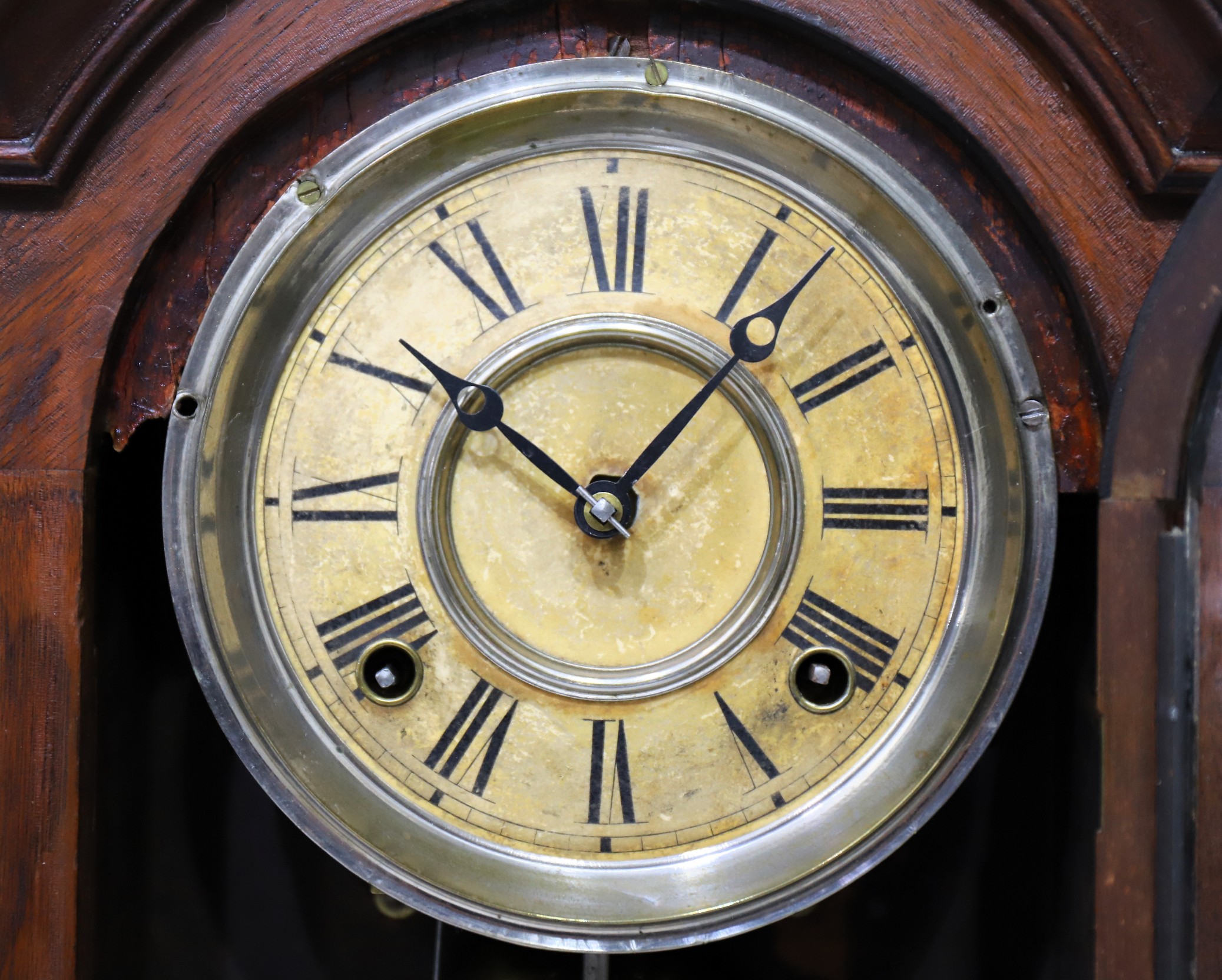 on a brass bell, regulated by a single barrel pendulum. The interior is papered and there is a good label on the back. $150–$300.