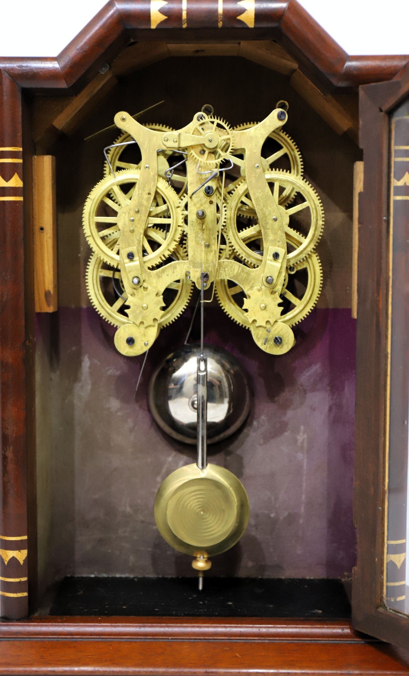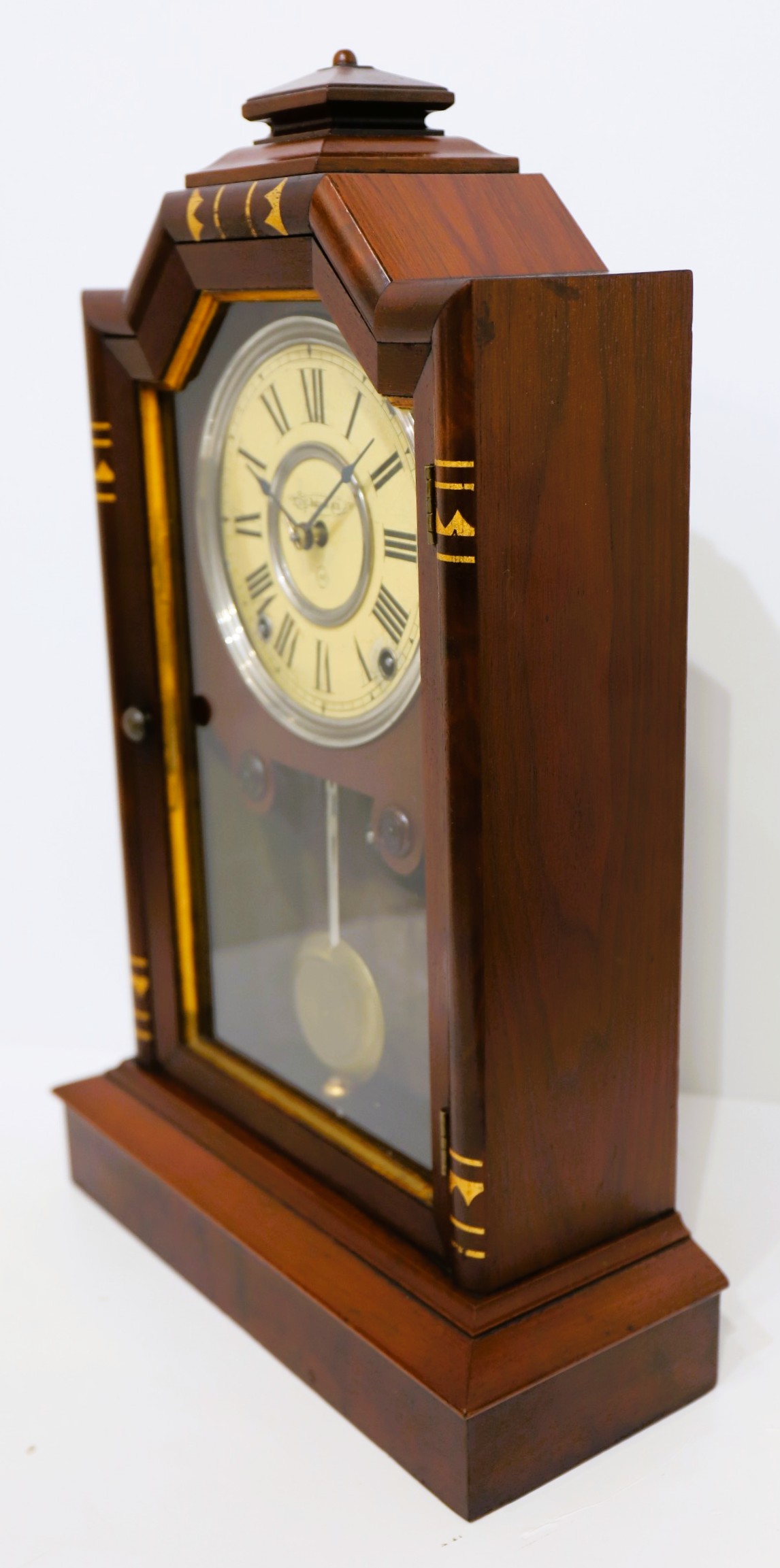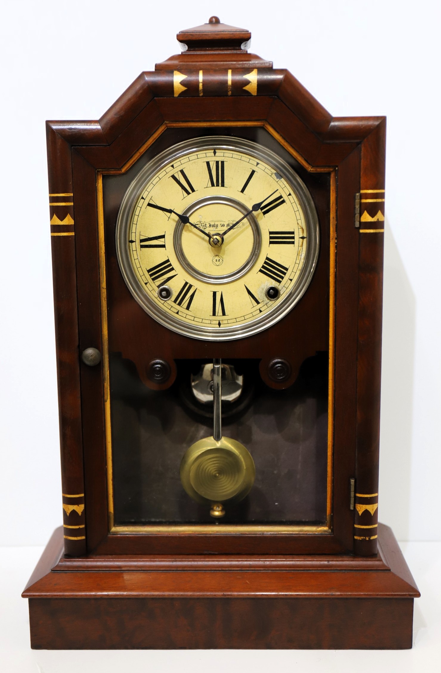 Seth Thomas Clock Co. “Atlanta”, ca. 1886. A beautiful rosewood and walnut case with gilding on the front. The 19.5-inch case has a rich, clean finish; the door glass
