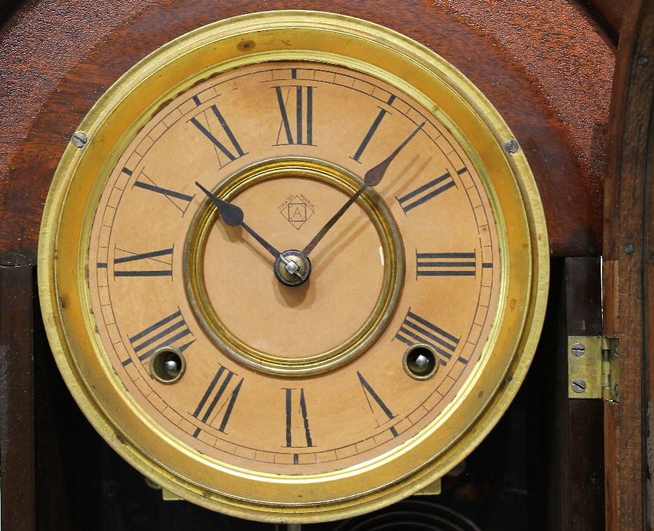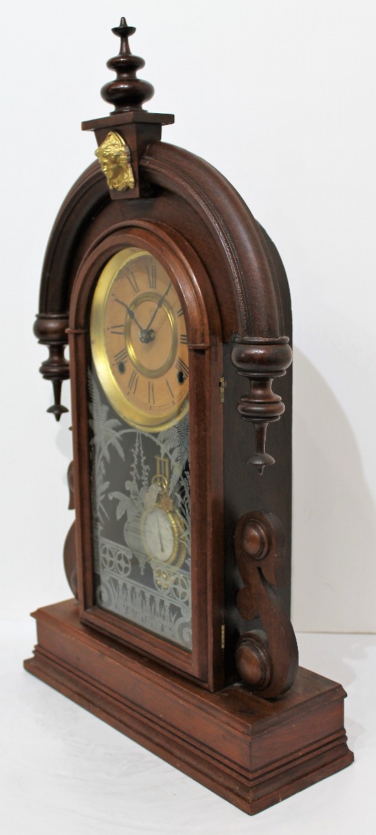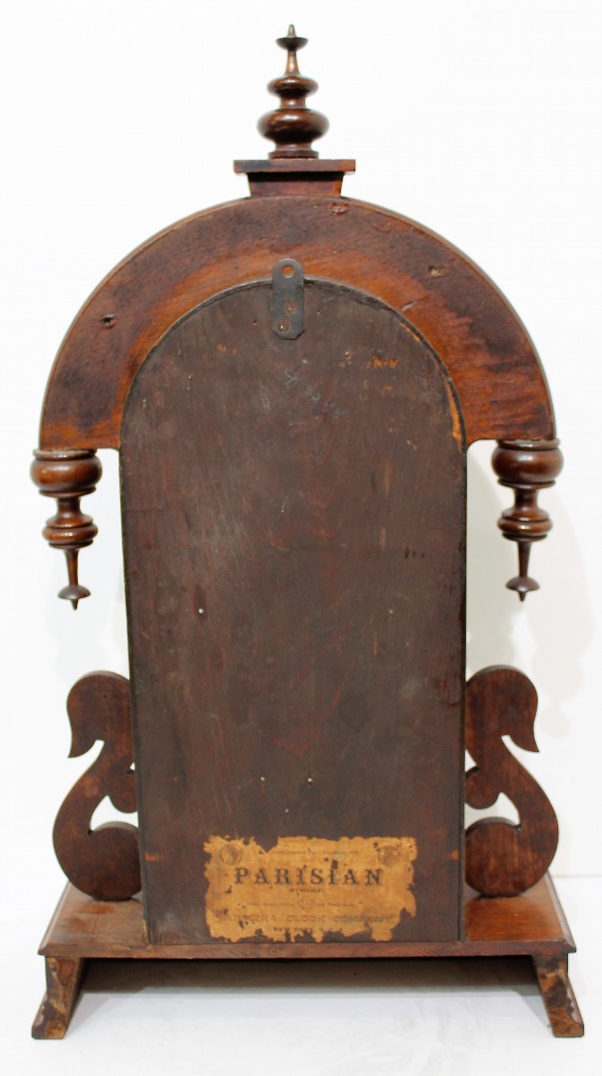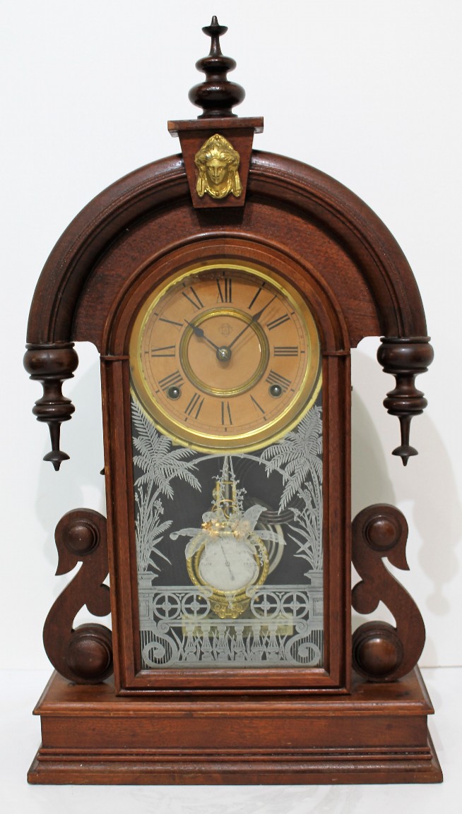 Ansonia Clock Co. “Parisian”, ca. 1880. A 23.5-inch walnut case with an old finish, an old door glass, and proper finials. The dial is paper with the Ansonia logo,