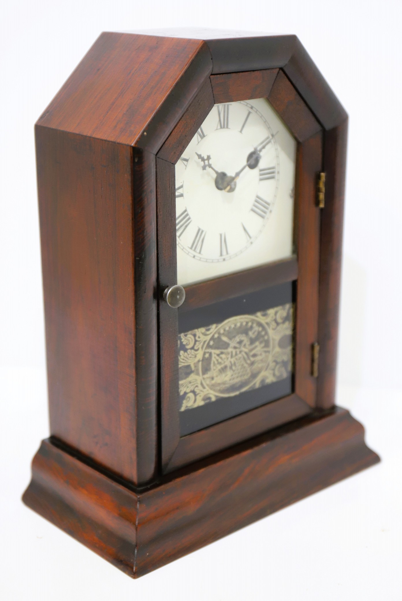 old and the lower glass shows a gilt image of a cannon and cannon balls draped with an American flag. The dial has been repainted,
