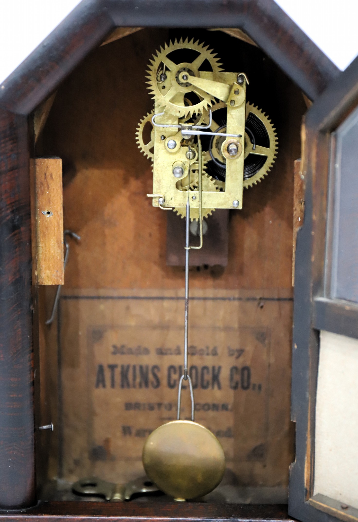 the hands are acceptable. The small, 30-hour, time-only movement is unsigned but was designed by the Atkins Clock Co. It is running strongly. There is a good label inside. AAC has sold several of this model in the last several years, most