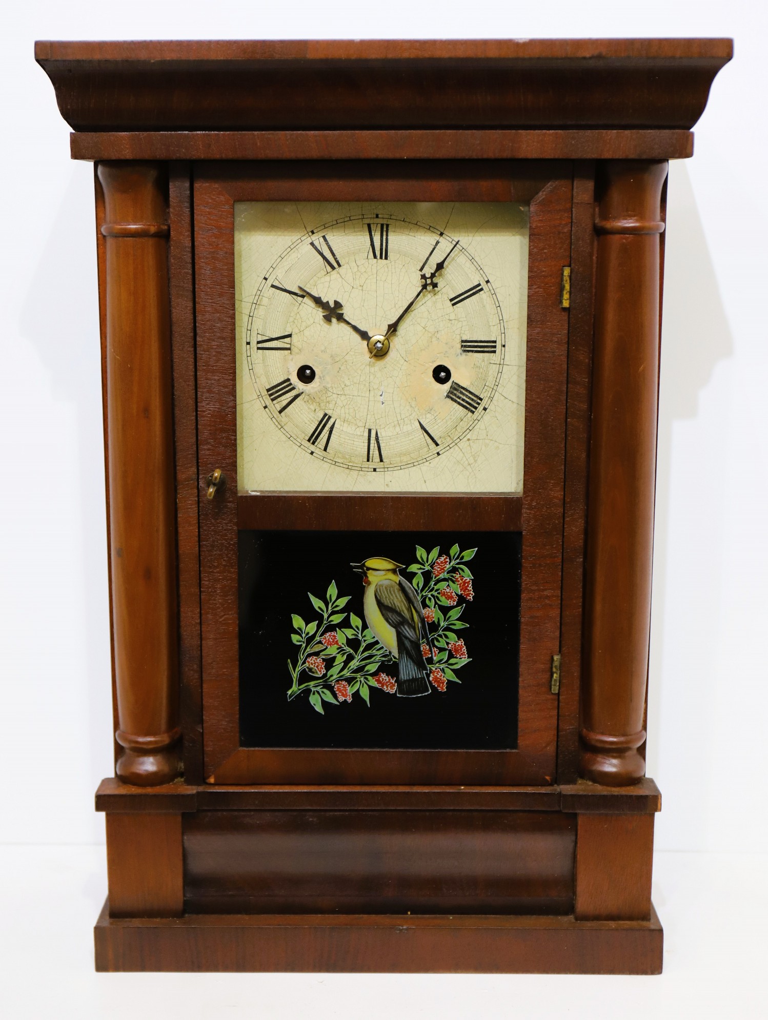 Chauncey Jerome 30-hour cottage, ca. 1842. An 18-inch shelf clock with good mahogany veneer and two old glasses, the tablet likely a repainted or stenciled image, and rebacked. The contoured metal holds very old paint with touch-ups, and mismatched Maltese hands, the minute hand being a likely replacement. The 30-hr time-and-strike brass movement is unsigned; it is running and striking. There is a good label inside. $50–$100.