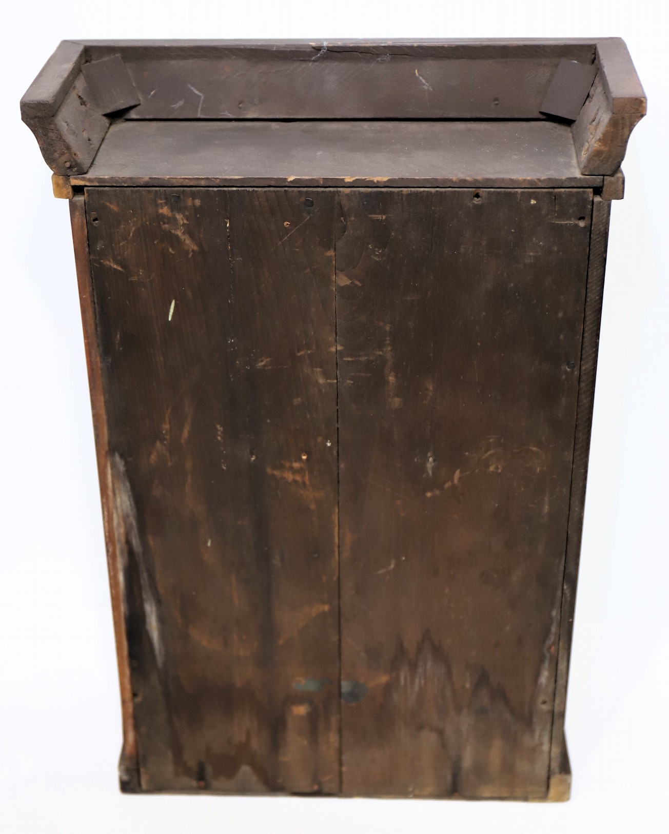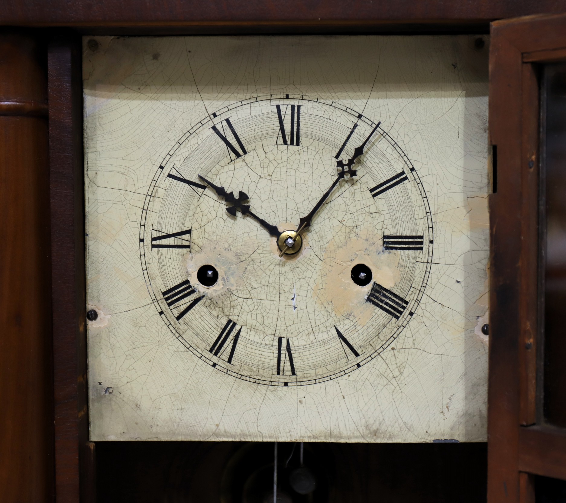 Mike Bailey took me behind the woodshed on this one, the date for the case is 1852 but the movement is a New Haven Clock Co. movement from the 1870's. Ouch and thanks, Mike!