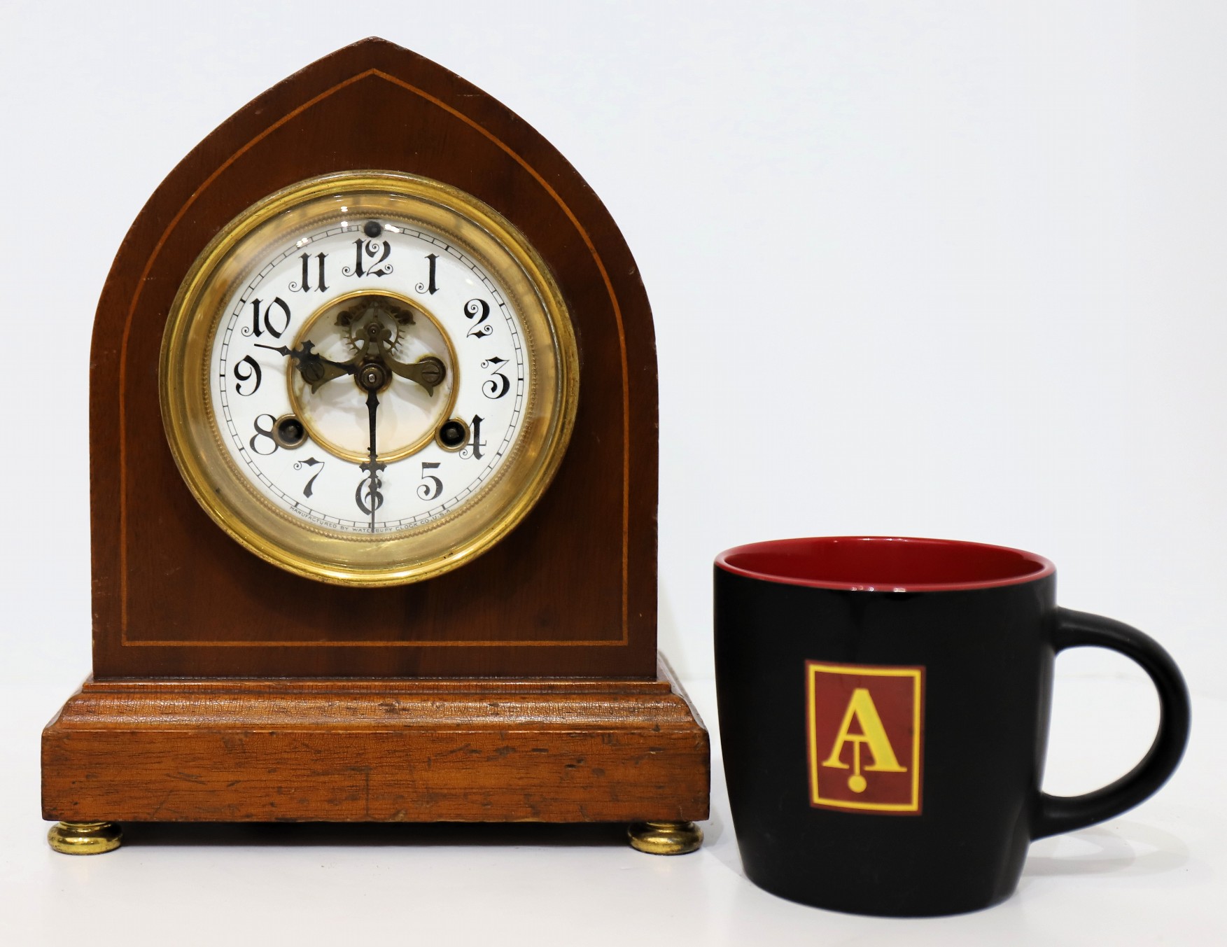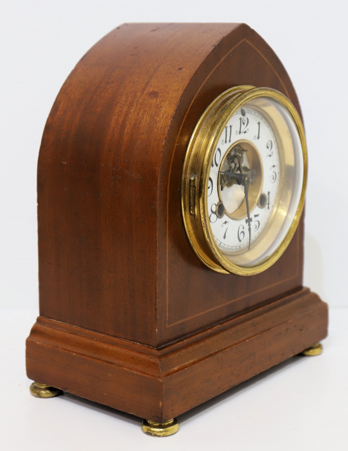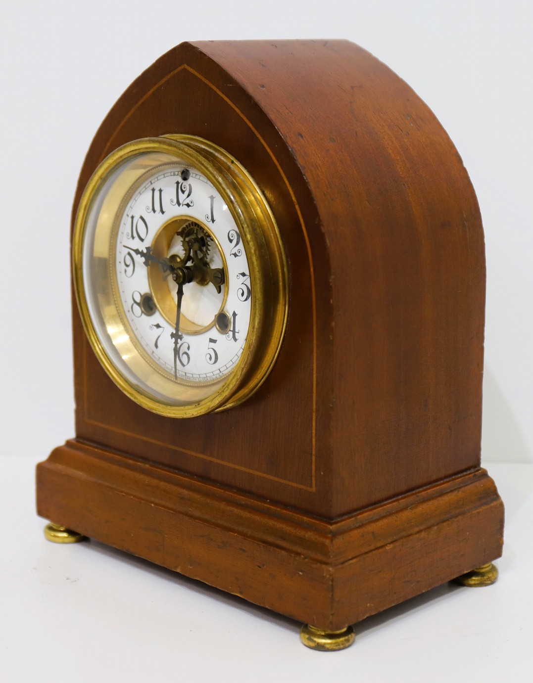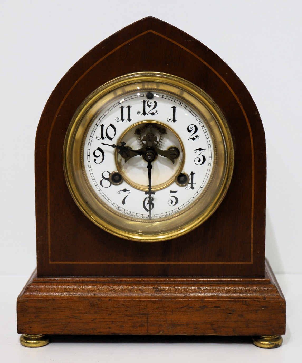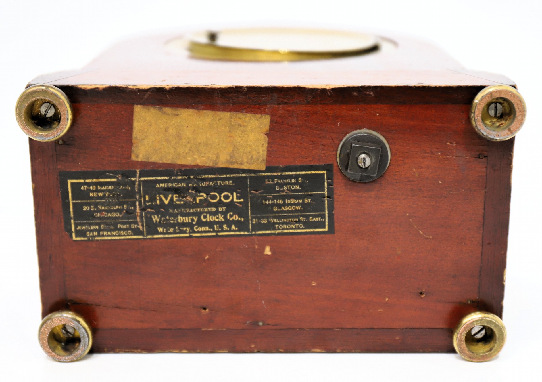 Waterbury Clock Co. “Liverpool”, ca. 1912. A 9-inch-tall mahogany cabinet with blond wood inlay on the front and four brass button feet. The glass is domed, the dial is