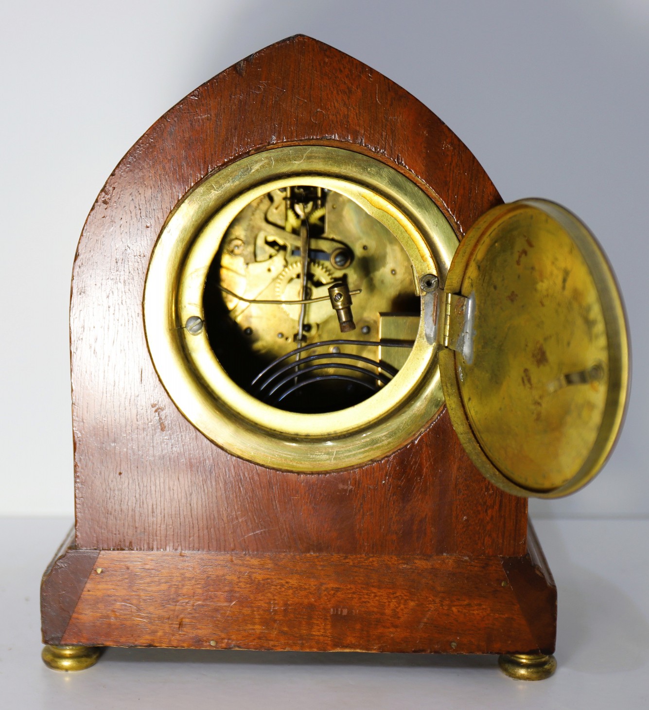 time-and-strike signed movement will not run and will need service; it strikes on a cathedral gong. Label on the bottom. Nice if you can get it running. $50–$150.