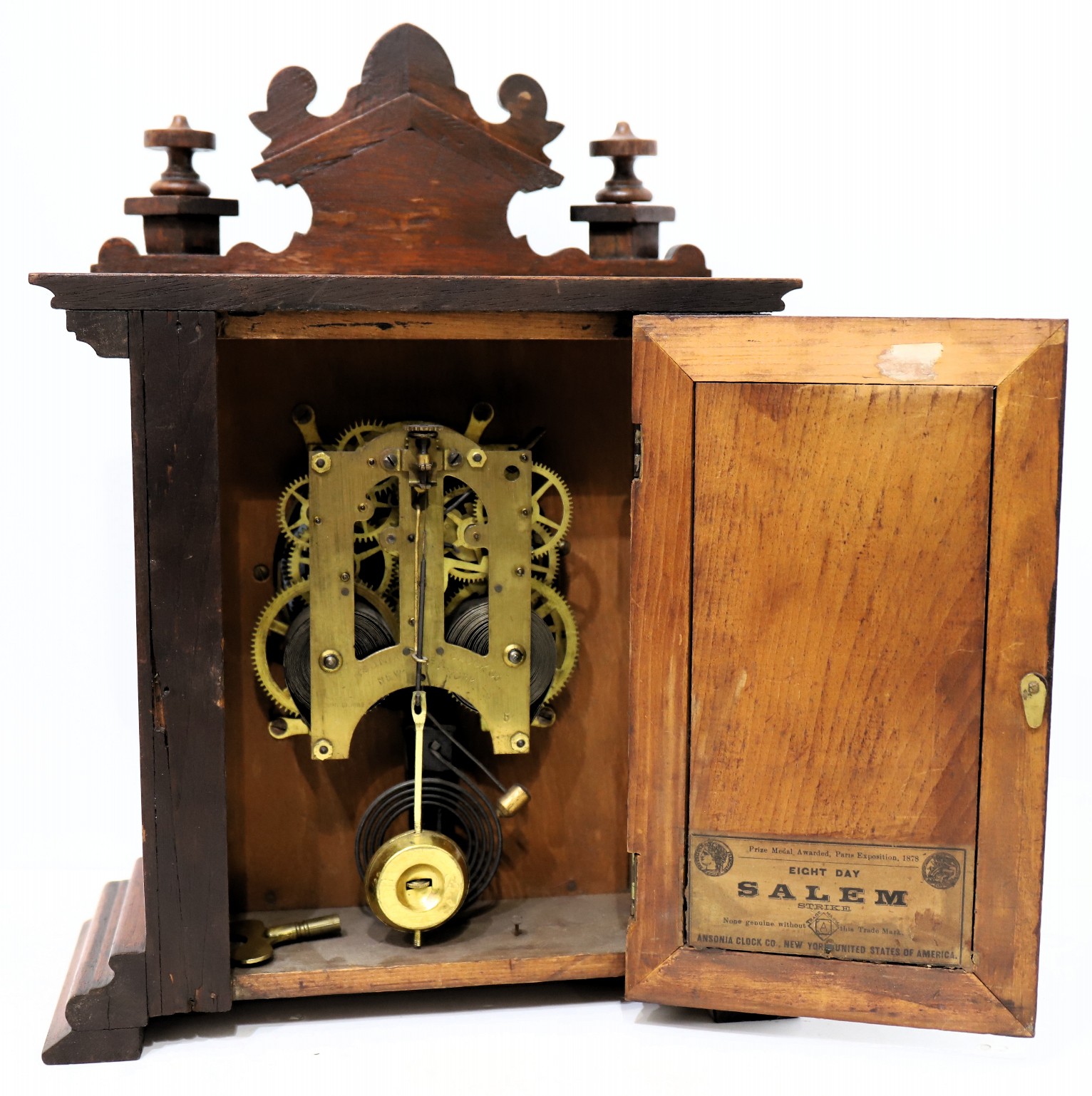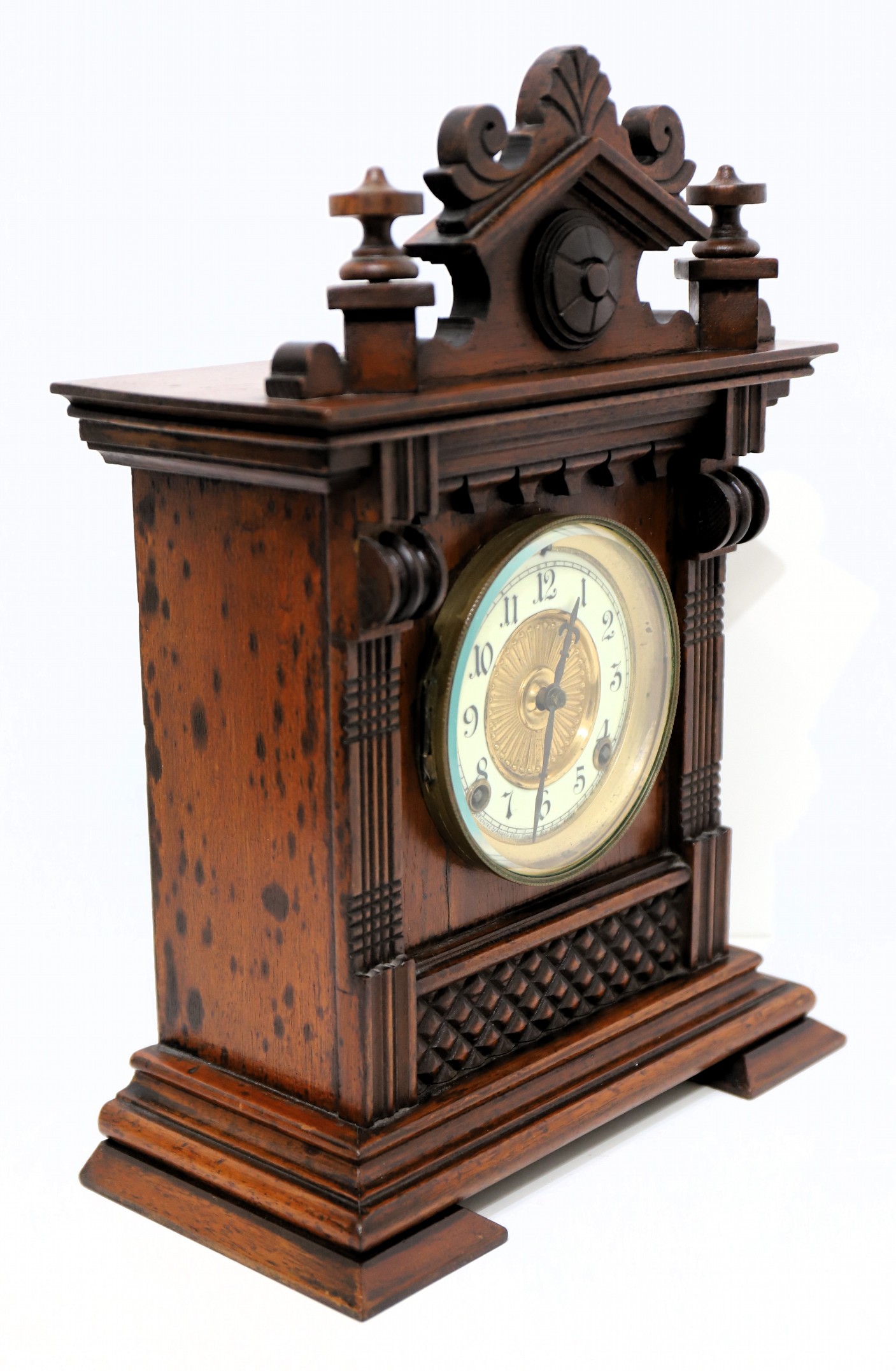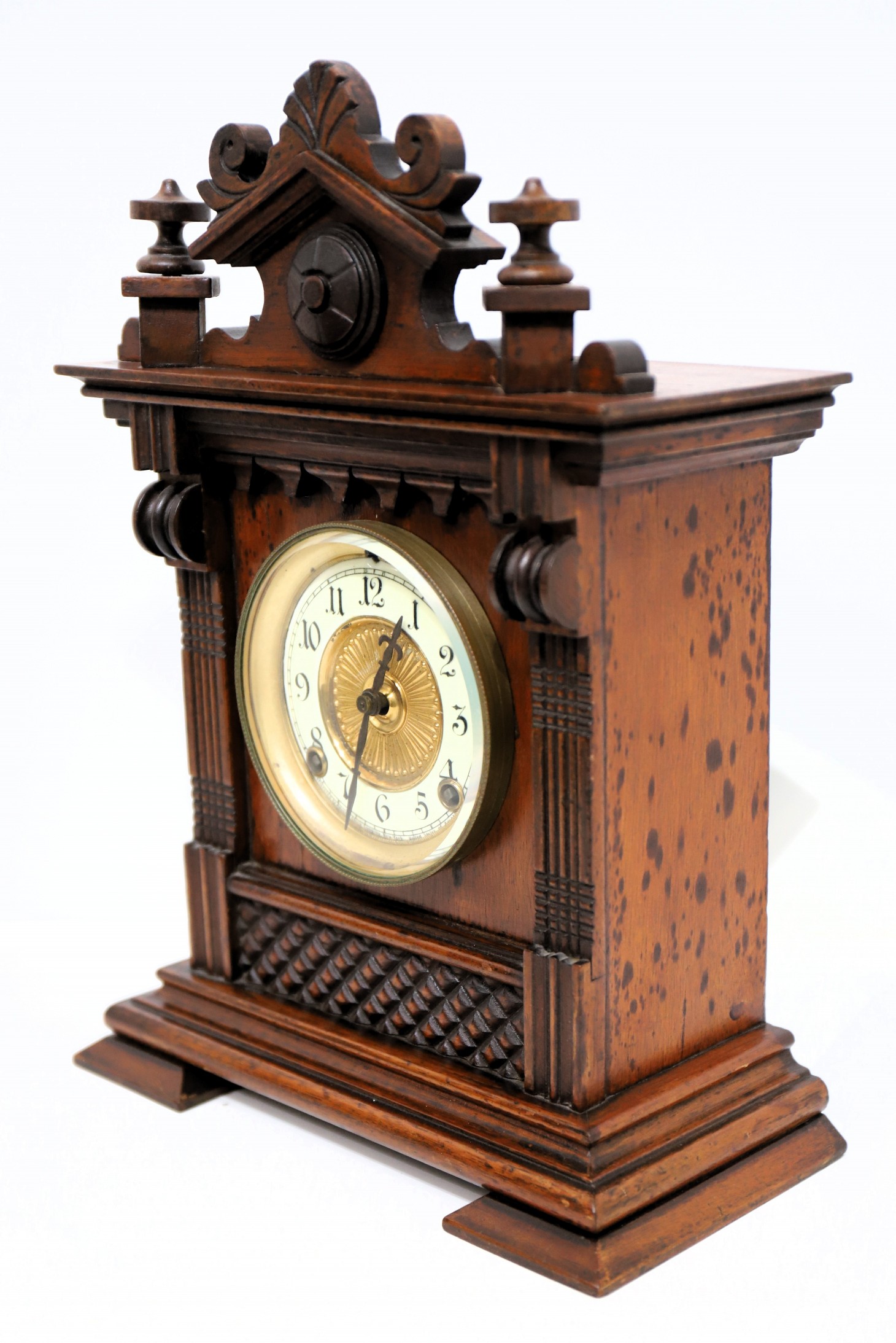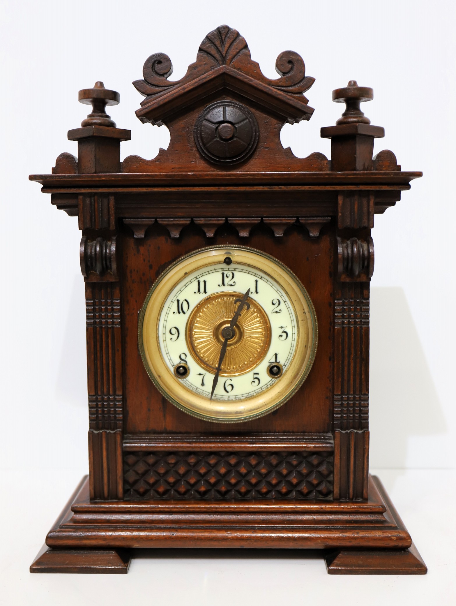 Ansonia Clock Co. “Salem”, ca. 1894. A 15-inch walnut case with an old finish. The flat dial glass is beveled, the dial porcelain with a gold center piece, and proper