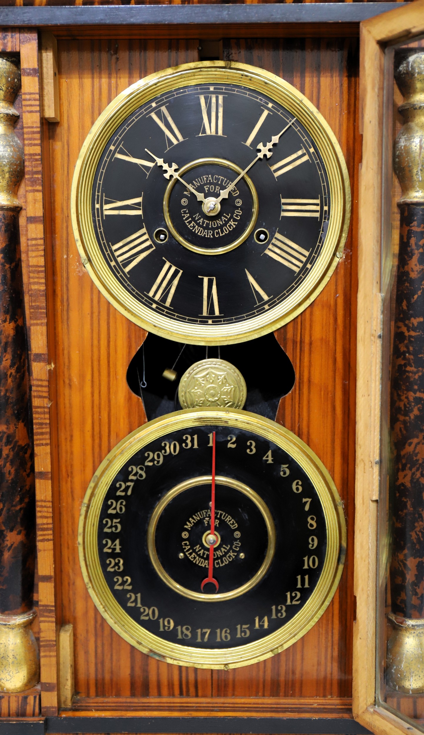 Calendar Clock”, ca. 1890. A 27-inch case that was grain-painted to resemble rosewood. This example retains most of that