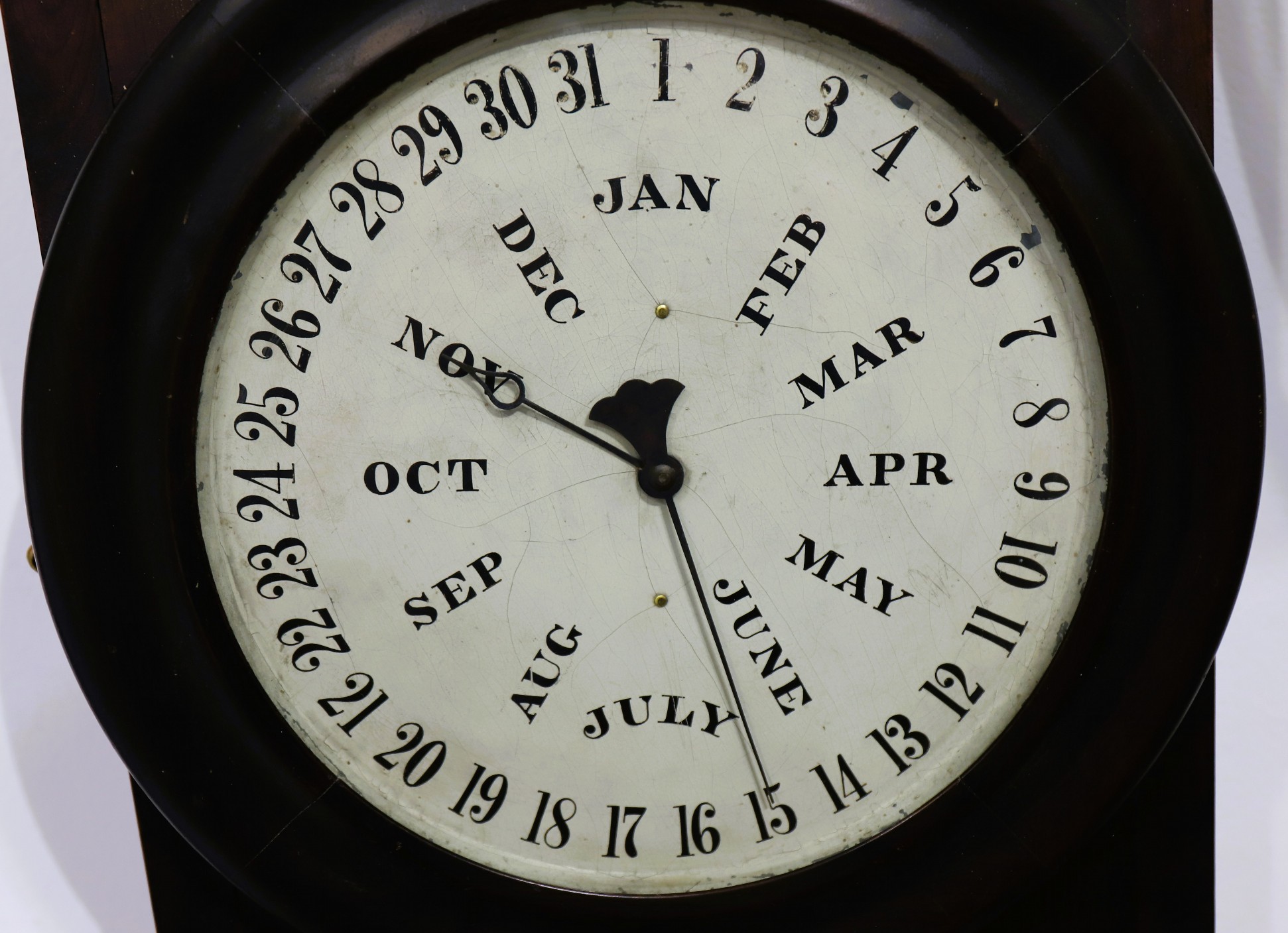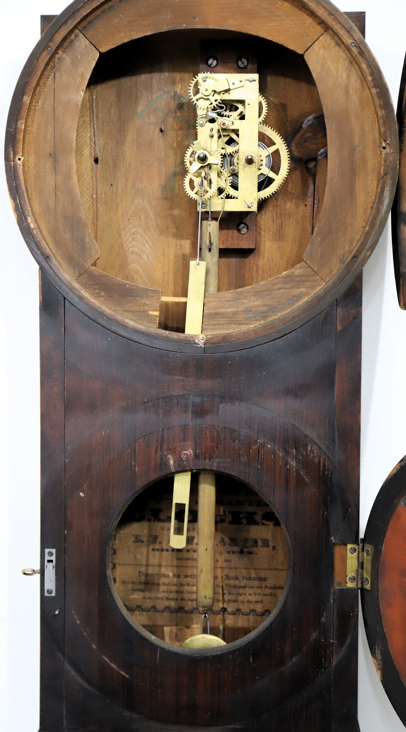 and was made by Elias Burwell, using B.B. Lewis’ patent calendar mechanism, as noted on the interior label. The clock is running