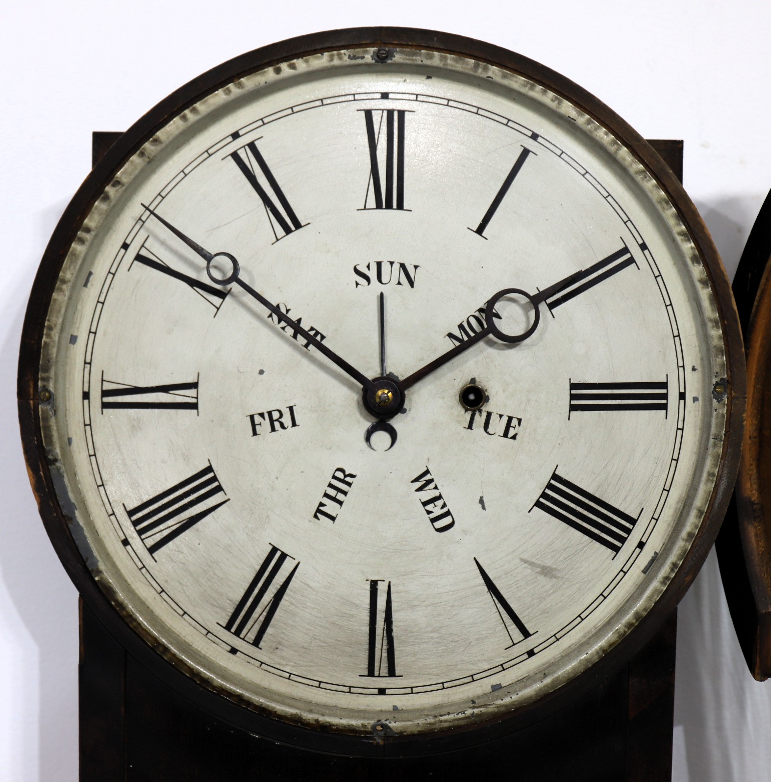 chipping. All five hands are correct. The 8-day spring-driven brass, time-only movement is as found in other examples