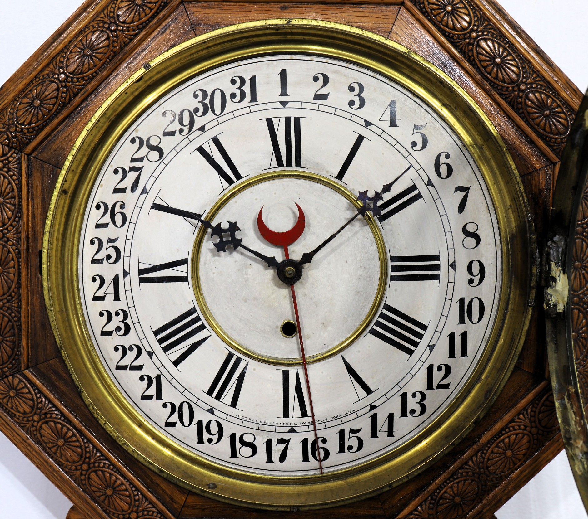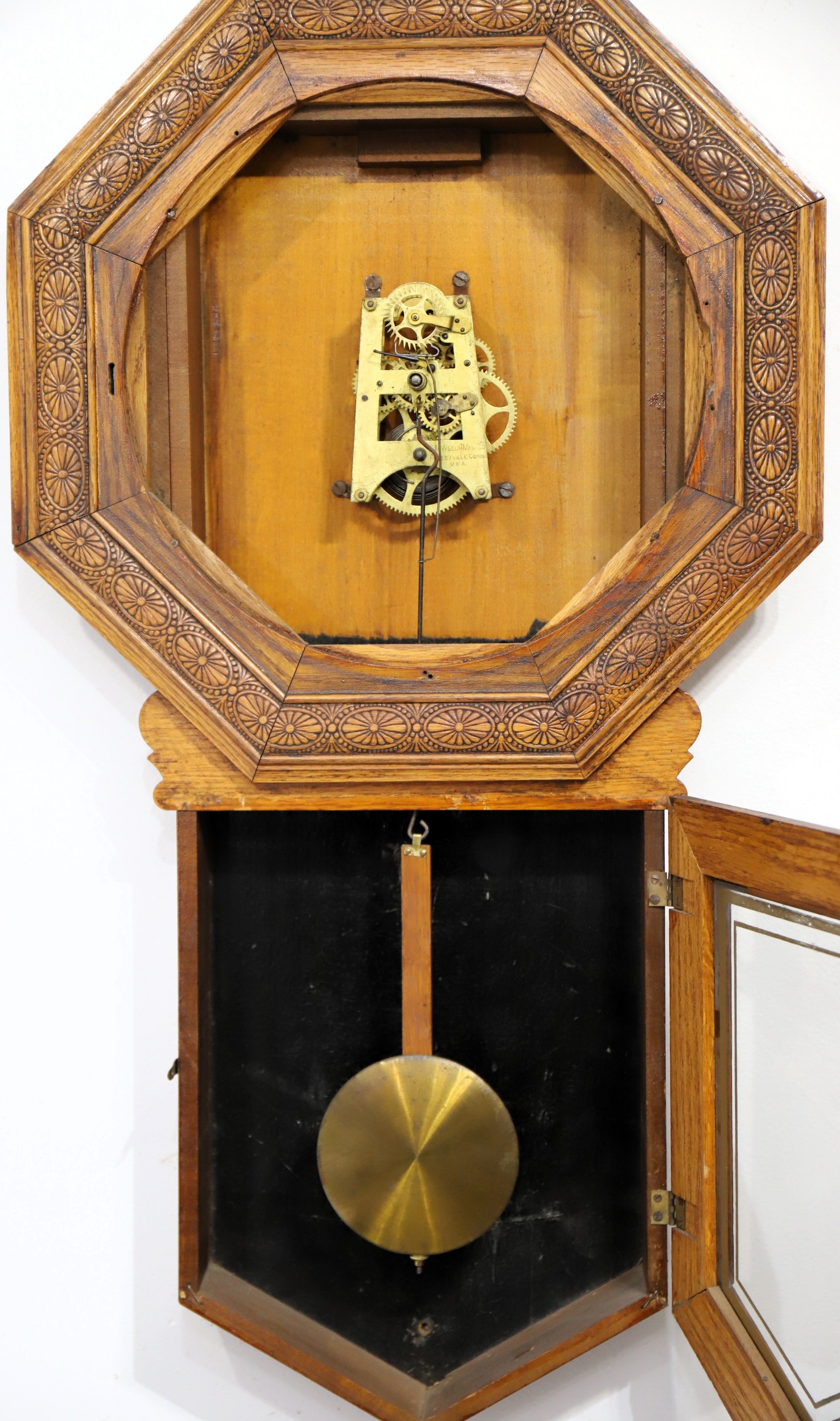 replacements for Welch hands. The 8-day, time-only movement is very dirty and will run only briefly; the built-in calendar is