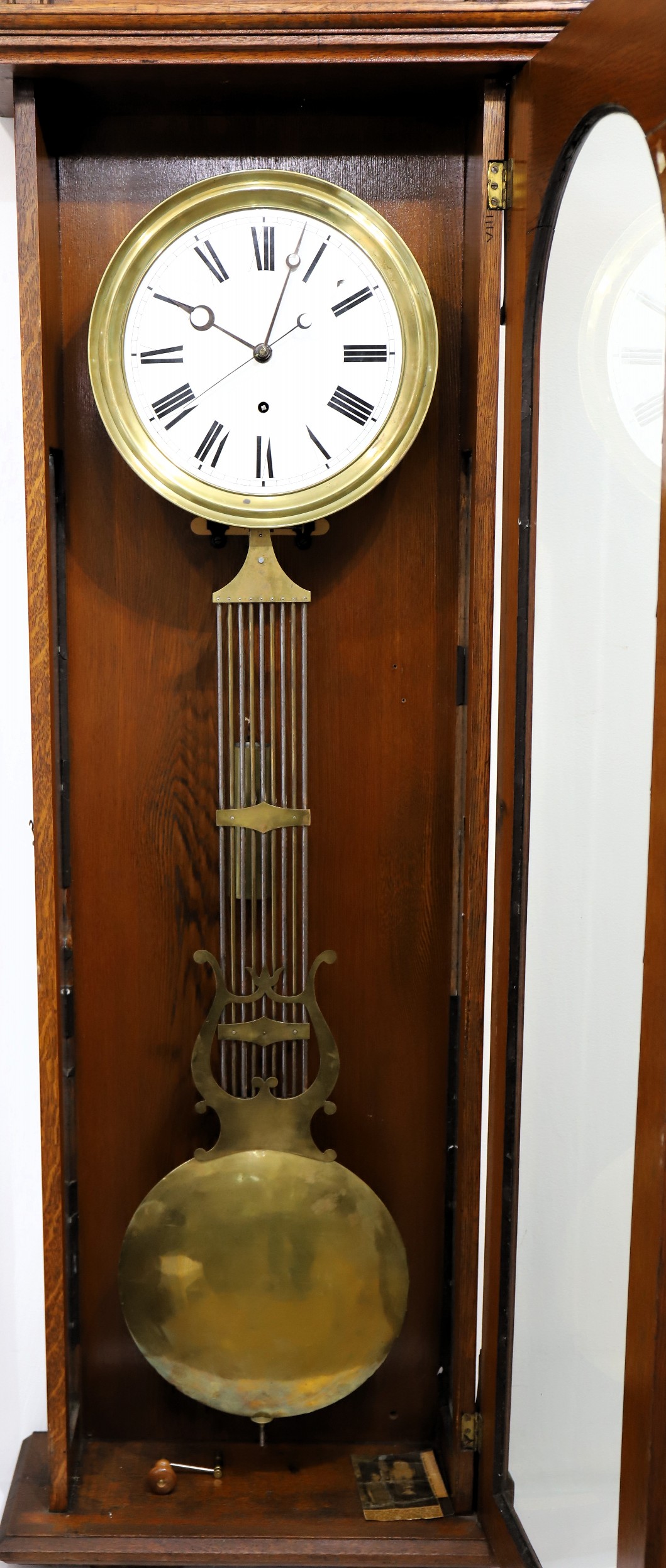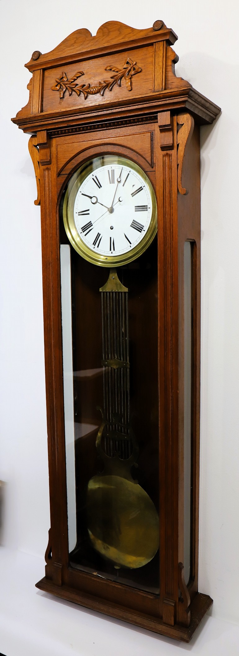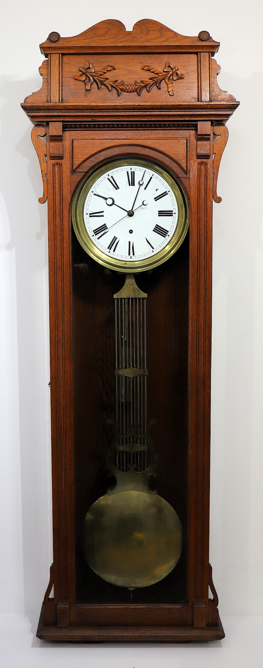Pinwheel regulator, ca. 1920. A 6-foot oak case with a